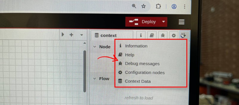 In this image, I opened the Node-RED sidebar menu, which shows important tools such as Information, Help, Debug Messages, and Context Data. These tools help me understand how flows work and debug my project during development.