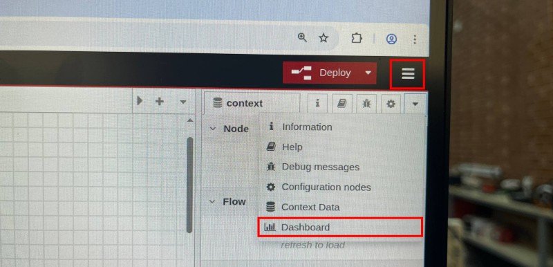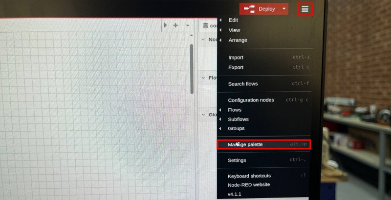 Here, I clicked on the hamburger menu (top right) and selected Manage palette. This is the place where you can install new nodes, remove unused ones, or check version updates. At this stage, I still did not have the dashboard node installed, so I opened this menu to search for it.