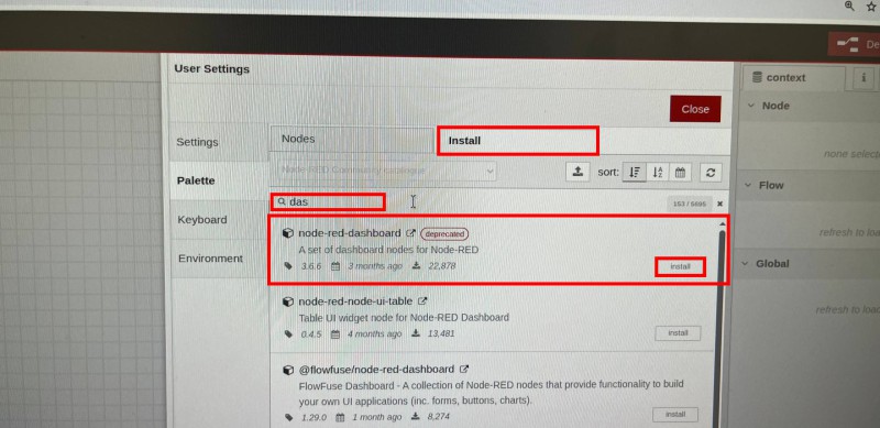 In this photo, I searched for “dashboard” inside the palette manager. The result showed node-red-dashboard, which is required to create UI elements such as buttons, switches, charts, gauges, and more. I clicked Install to add it to my Node-RED environment.