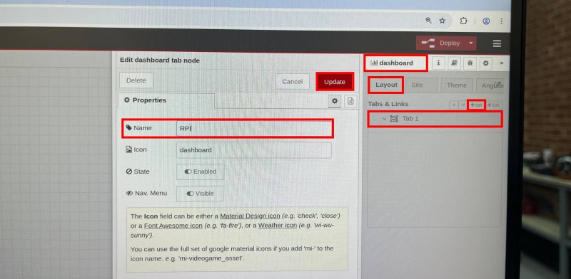 In this photo, I created a new dashboard tab and named it “RPI” because I tested Node-RED with the Raspberry Pi. I also clicked Update to save the configuration. This tab will contain all UI elements, such as switches and buttons.