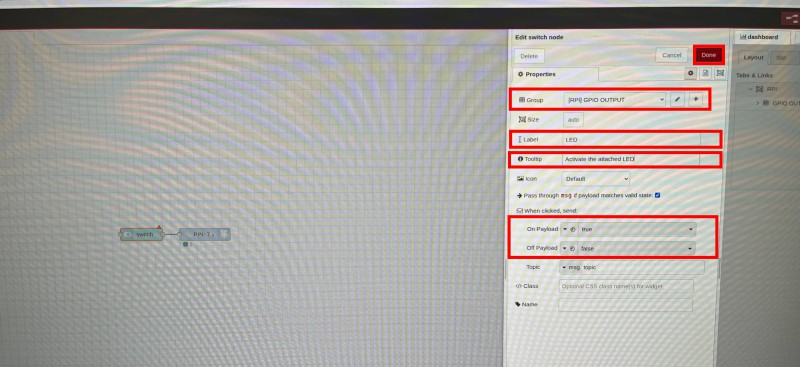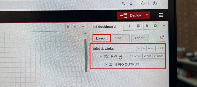 Here, I created a group inside my tab. Groups help organize UI widgets. I created a group called “GPIO OUTPUT”, where I will put my switches that control the Raspberry Pi’s GPIO pins.