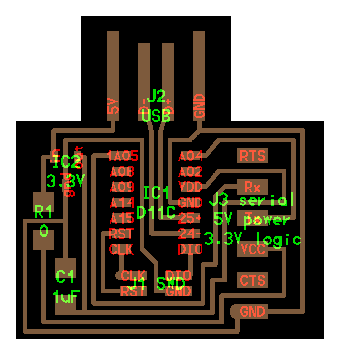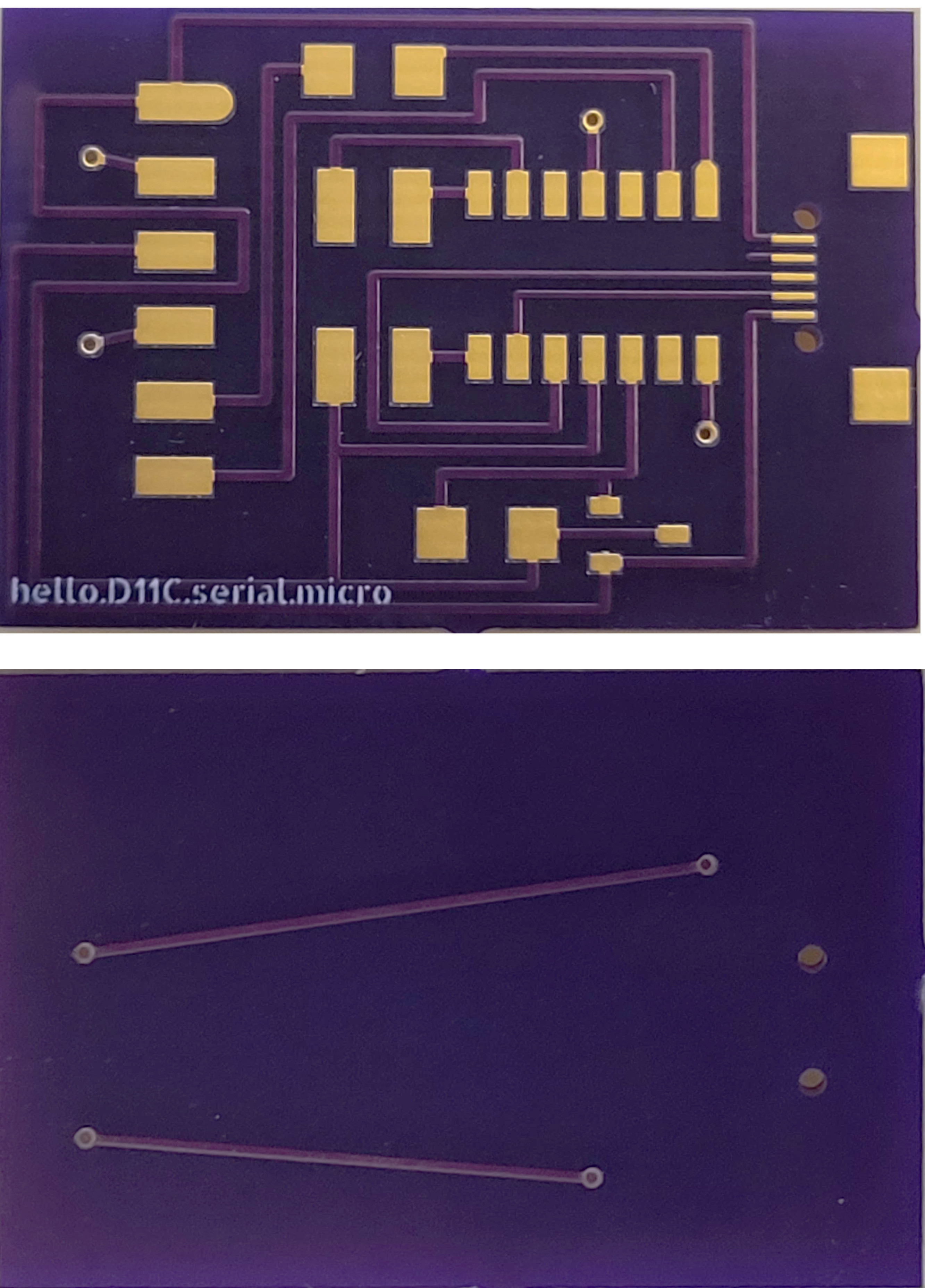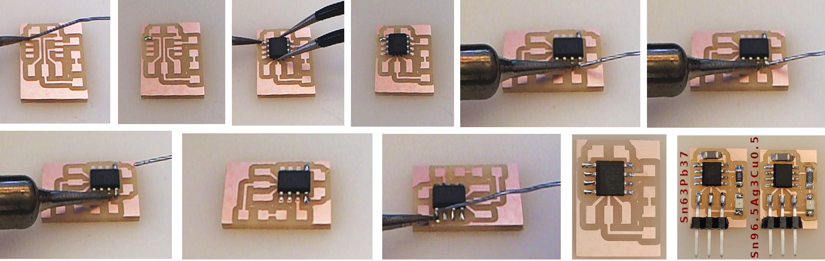 PCB (Printed Circuit Board) fabrication dead bug circuits etching set-up, feature size, batch lithography, transfer, print ferric/cupric chloride, ammonium/sodium persulfate citric acid, peroxide SDS water consumption waste machining finish machines tools 0.010 1/64 1/32 V-bits tapered bits fixturing underlay zeroing mounting lowering probing set-screws, collets lifetime deburring cleaning climb vs conventional nesting registration vinyl cutter flex connections encapsulation milling laser cutter engraver combined LIG printing conducting inks plating sewing PCB materials rigid FR4 (epoxy glass) FR1 (phenolic paper) garolite flex Kapton, Pyralux #1 epoxy film, #1126 copper tape high-frequency teflon glass copper 0.5 oz: 17.5 um 1.0 oz: 35 um 2.0 oz: 70 um board houses JLCPCB, PCBWay, OSH Park, Aisler, PCB, assembly design rules width/spacing (15, 5 mils) layers 1, 1.5, 2, 2+, 4, N mechanical, drill, solder mask, silk screen vias wires, header, rivets, plated, blind, buried components through-hole surface-mount chip-scale breadboards assembly solder iron station fume extractor microscope burns ROHS types lead-free wire paste SDS leaded wire paste SDS low-temp wire paste bismuth eutectic tinning wetting manual, drag, wave cold solder joints, solder bridges, checking joints flux core, paste, pen reflow stencil hot plate, convection oven, IR FR1 vs FR4 hot air wire, paste preheat QFN, MLF, CSP, BGA, ... heat-and-squish, tin-and-heat stuffing component orientation tacking down parts bottom to top, inside to outside headers washing desoldering braid tweezers vacuum hot air gravity cutting traces, adding jumpers placement pick-and-place encapsulation CAM formats Gerber/RS-274X png resolution FlatCAM pcb2gcode gerber2img gerber2png wiki mods tool changer video trace width traces traces+exterior interior 1/64" 0.010" V-bit fiber laser galvo laser pad, trace size debugging inspect, reflow solder joints check component orientation, values verify data sheets confirm connector orientation measure supply voltages probe I/O signals Quentin Isaak Sean group assignment: • characterize the design rules for your in-house PCB production process • submit a PCB design to a board house individual assignment: • make and test an embedded microcontroller system that you designed • extra credit: make it with another process