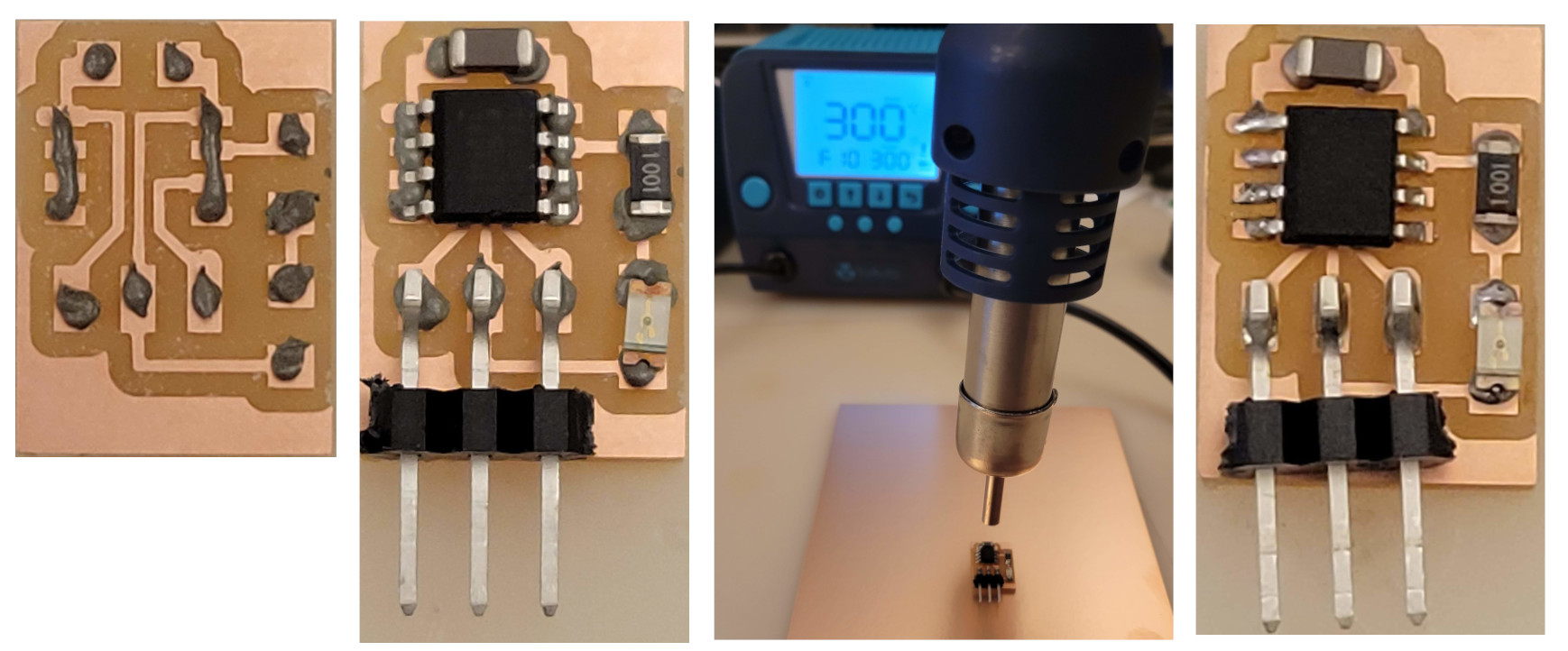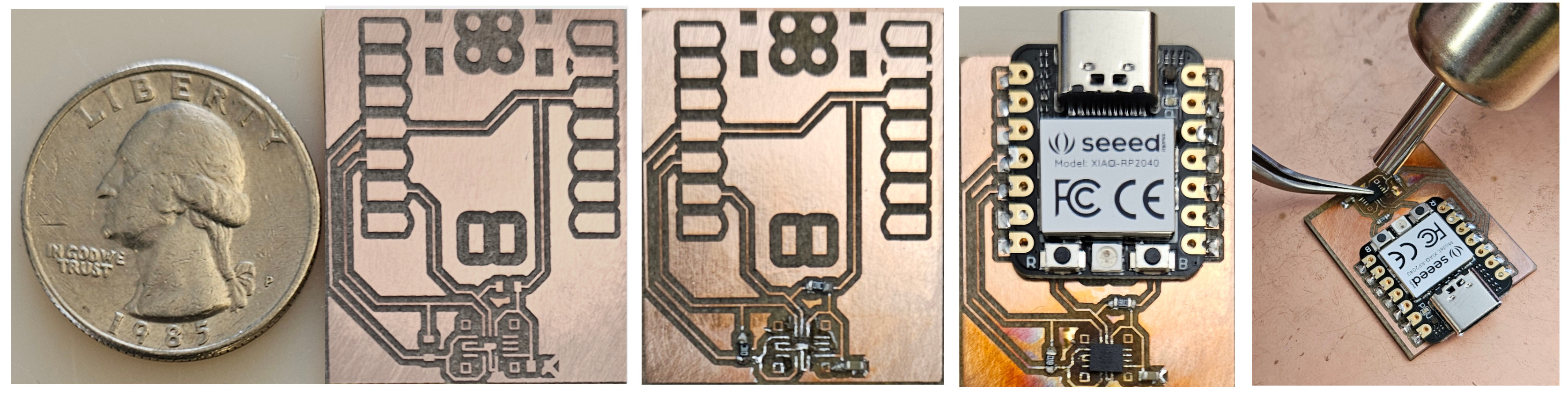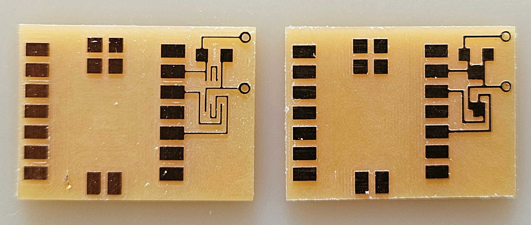 PCB (Printed Circuit Board) fabrication dead bug circuits etching set-up, feature size, batch lithography, transfer, print ferric/cupric chloride, ammonium/sodium persulfate citric acid, peroxide SDS water consumption waste machining finish machines tools 0.010 1/64 1/32 V-bits tapered bits fixturing underlay zeroing mounting lowering probing set-screws, collets lifetime deburring cleaning climb vs conventional nesting registration vinyl cutter flex connections encapsulation milling laser cutter engraver combined LIG printing conducting inks plating sewing PCB materials rigid FR4 (epoxy glass) FR1 (phenolic paper) garolite flex Kapton, Pyralux #1 epoxy film, #1126 copper tape high-frequency teflon glass copper 0.5 oz: 17.5 um 1.0 oz: 35 um 2.0 oz: 70 um board houses JLCPCB, PCBWay, OSH Park, Aisler, PCB, assembly design rules width/spacing (15, 5 mils) layers 1, 1.5, 2, 2+, 4, N mechanical, drill, solder mask, silk screen vias wires, header, rivets, plated, blind, buried components through-hole surface-mount chip-scale breadboards assembly solder iron station fume extractor microscope burns ROHS types lead-free wire paste SDS leaded wire paste SDS low-temp wire paste bismuth eutectic tinning wetting manual, drag, wave cold solder joints, solder bridges, checking joints flux core, paste, pen reflow stencil hot plate, convection oven, IR FR1 vs FR4 hot air wire, paste preheat QFN, MLF, CSP, BGA, ... heat-and-squish, tin-and-heat stuffing component orientation tacking down parts bottom to top, inside to outside headers washing desoldering braid tweezers vacuum hot air gravity cutting traces, adding jumpers placement pick-and-place encapsulation CAM formats Gerber/RS-274X png resolution FlatCAM pcb2gcode gerber2img gerber2png wiki mods tool changer video trace width traces traces+exterior interior 1/64" 0.010" V-bit fiber laser galvo laser pad, trace size debugging inspect, reflow solder joints check component orientation, values verify data sheets confirm connector orientation measure supply voltages probe I/O signals Quentin Isaak Sean group assignment: • characterize the design rules for your in-house PCB production process • submit a PCB design to a board house individual assignment: • make and test an embedded microcontroller system that you designed • extra credit: make it with another process