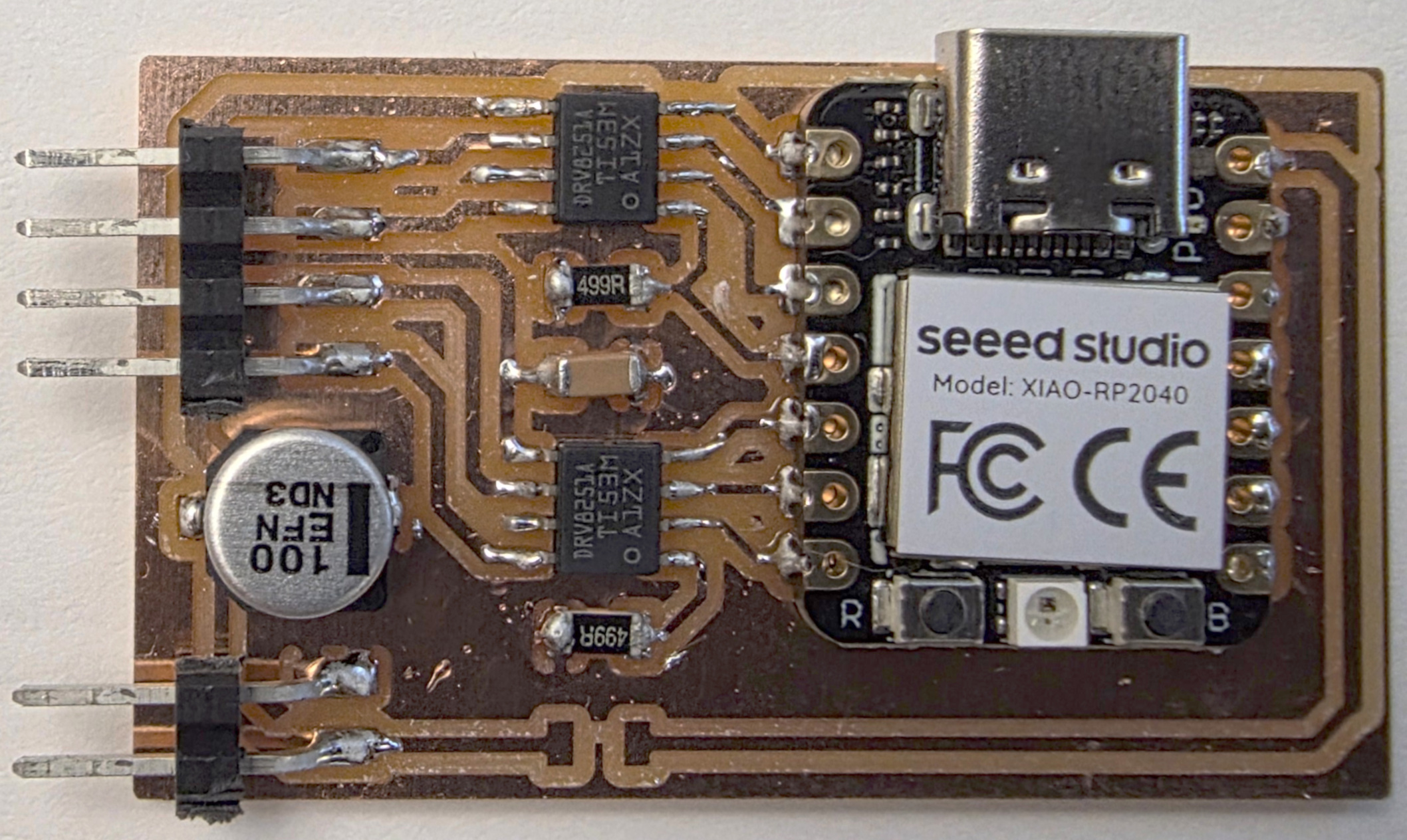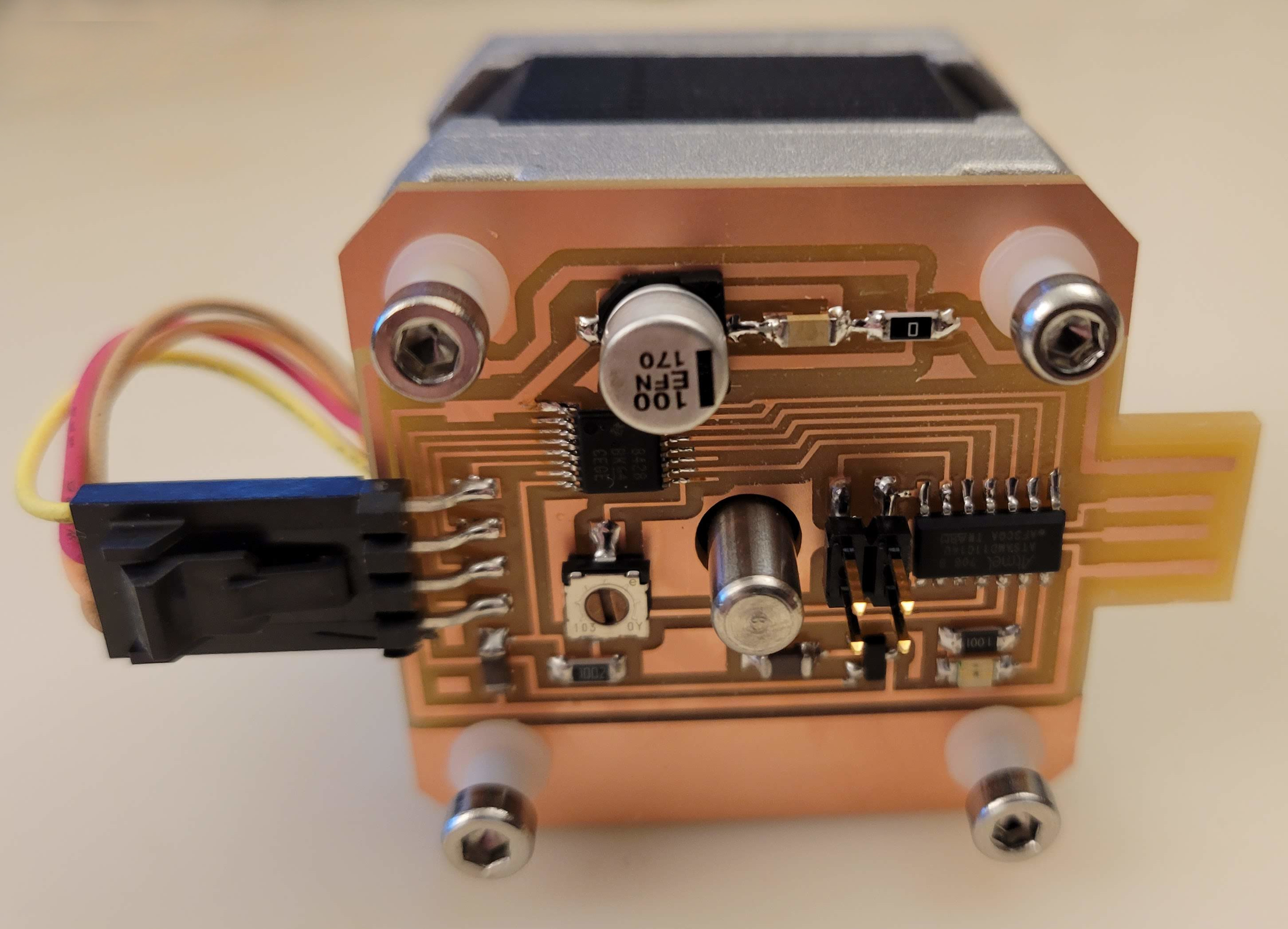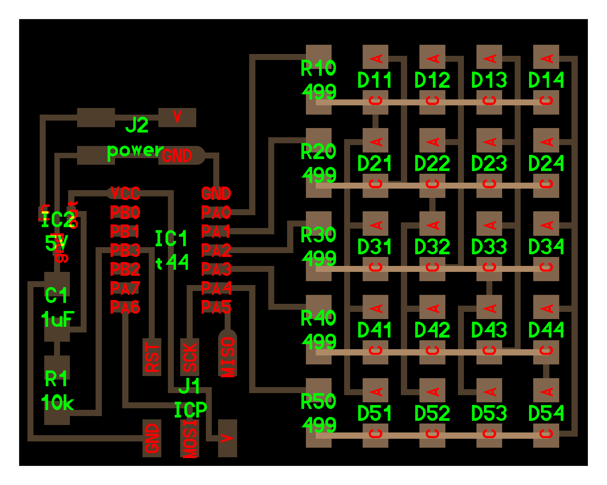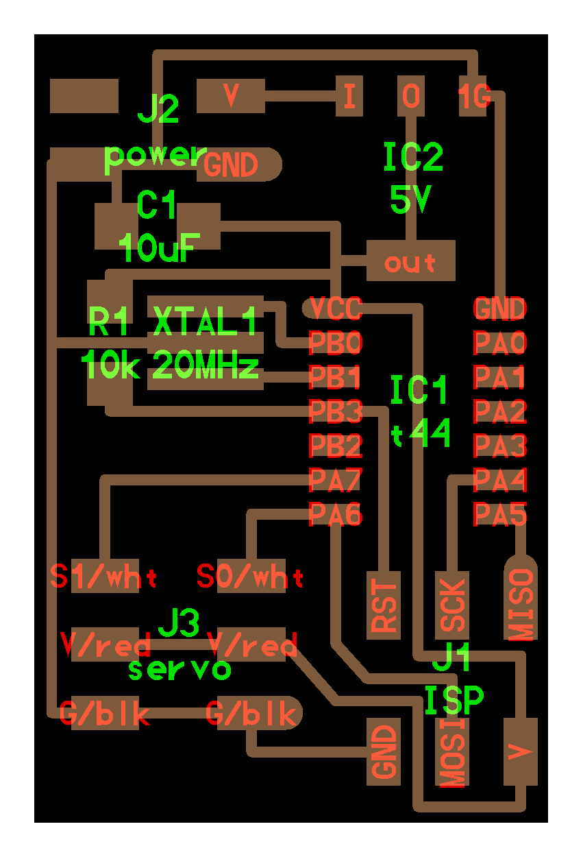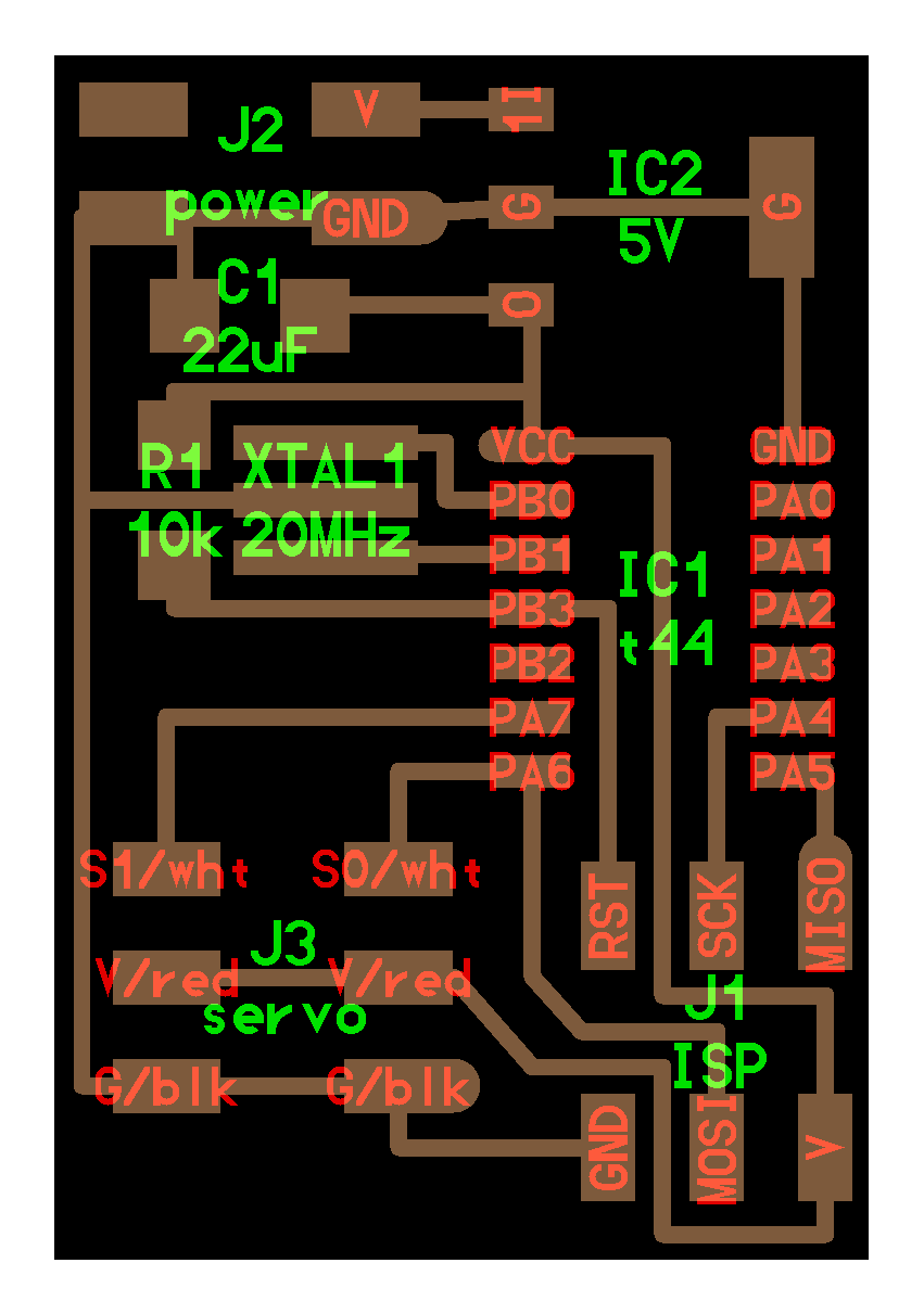 electrical safety ~1 mA: OK ~10 mA: shock, contraction ~100 mA: fibrillation body: M ohm external, k ohm internal dielectric breakdown: ~kV/mm supply capacitors inductive flyback polarity protection diode, MOSFET level shift MOSFET connector polarization, orientation circuit protection power wire gauge USB charger hub battery module meter power supply bench switching, linear, regulated supercapacitor LiPo battery charge controller storage wireless current measurement in-line meter supply regulation sense resistor magnetic field inductance LED current limiting hello.button-blink.C3 board components traces interior hello.button-blink.C3.ino hello.button-blink.C3.py video PWM hello.fade.C3.py video Charlieplexing hello.array.44 board components traces traces+exterior interior C makefile video hello.array.44.2 board components bottom vias top top+exterior interior C makefile video RGB LED pixels lights wires NeoPixel/WS2812B/SK6812 hello.WS2812B board components top interior hello.WS2812B.RP2040.py video Arduino Micropython library 3 in 1 hello.RGB.45 board components traces traces+exterior interior C makefile video LEDs diode drop, series-parallel MOSFET N, P, N floating gates, gate resistors dissipation, Rds, switching BJT, BiCMOS, IGBT hello.LEDs.t412 board components traces traces+exterior interior hello.LEDs.t412.ino video thermal runaway eye safety displays LCD HD44780 library hello.LCD.44 board components traces traces+exterior interior C makefile video I2C PCF8574 library hello.I2C.t1614 hello.LCD.I2C.ino video OLED SSD1306 hello.SSD1306.RP2040 board components top holes interior hello.SSD1306.RP2040.py ssd1306.py video library scripts hello.SSD1306.45 board components traces traces+exterior interior C makefile video TFT ILI9341 library hello.ILI9341.SW.D21E board components traces traces+exterior interior video hello.ILI9341.HW.D21E board components top top+exterior bottom holes interior video ST7735 video E Ink modules video RS170, NTSC, PAL, SECAM, VGA 75 ohm impedance hello.video.44 board components traces traces+exterior interior C makefile video SPI TVout thinner client color DC motor H-bridge TB67H451AFNG,EL TB67H453FNG(O,EL) hello.TB67H451.RP2040 board components top interior hello.TB67H451.RP2040.ino hello.TB67H451.RP2040.py boot.py video hello.H-bridge.D11C board components traces traces+exterior interior hello.H-bridge.D11C.ino video A4950 hello.H-bridge.44 board components traces traces+exterior interior C makefile video Dual H-bridge DRV8847 torque, power, efficiency, gearing vibration heat speaker MP3 module library hello.DFR0299.RP2040 pro sch pcb board components top holes interior hello.DFR0299.ino video I2S MAX98357A library module hello.MAX98357A.RP2040 board components top holes interior hello.MAX98357A.RP2040.ino video PWM class D, library hello.TB67H451.RP2040.audio.ino hello.TB67H451.RP2040.audio.py boot.py video hello.TB67H451.RP2040.wave.py sample.py hello.py convert_byterray.py video hello.TB67H451.RP2040.wave.ino sample.ino sample.main.ino convert.py video hello.speaker.D11C board components traces traces+exterior interior hello.speaker.D11C.ino hello.speaker-registers.D11C.ino video solenoid servo motor 50 Hz ~1-2 ms PWM (dis)continuous rotation ATtiny412 hello.servo.t412 board components traces traces+exterior interior hello.servo.t412.ino hello.servo-registers.t412.ino video ATSAMD11C hello.servo-D11C board components traces traces+exterior interior hello.servo-registers.D11C.ino video ATtiny44 hello.servo.44 board components traces traces+exterior interior ZLDO1117 hello.servo.44.1 board components traces traces+exterior interior LM2940 C (hardware PWM) makefile C (two-channel, software PWM) makefile video brushless DC motor (BLDC) efficiency, density, reliability, noise inrunner, outrunner, pancake, fan, gimbal Kv (RPM/V) phases/rotation (6 typical) drive waveform open-loop, closed-loop control back EMF (BEMF) sensing ~1 (fan), 10 (drone), 100 (skateboard), 1000 (car) A,$ triple half-bridge A4949 hello.A4949.RP2040 board components top interior hello.A4949.RP2040.py video electronic speed controller (ESC) hello.ESC.44 board components traces traces+exterior interior C makefile video firmware servo PWM power input, output initialization, calibration stepper motor types wire identification step size (1.8 degrees typical) full, half, microstepping current, duration field oriented control step and direction DRV8428 hello.DRV8428-D11C board components traces traces+exterior holes interior hello.DRV8428-D11C.ino video hello.DRV8428-D11C-NEMA17 board components traces traces+exterior holes interior code video H-bridge DRV8251ADDAR hello.DRV8251A.RP2040 pro sch pcb board components traces interior hello.DRV8251A.RP2040.stepper.ino video TB67H451AFNG,EL hello.stepper.bipolar.D11C board components top top+exterior bottom holes interior hello.stepper.bipolar.D11C.ino video driver electro-permanent electrostatic motor control Allegro TI Trinamic Pololu motion control solid state relay AC vs DC IC hockey puck wiring voltage drop: ~V safety: switch hot side US: black (red,blue) = hot, white = neutral, green(-yellow) = ground EU: brown (black,gray) = hot, blue = neutral, green-yellow = ground switched outlet shape memory piezo polymer artificial muscle fishing line conducting thread actuator LCE soft inflatable pneumatics hydraulics Lingdong group assignment: • measure the power consumption of an output device individual assignment: • add an output device to a microcontroller board you've designed, and program it to do something