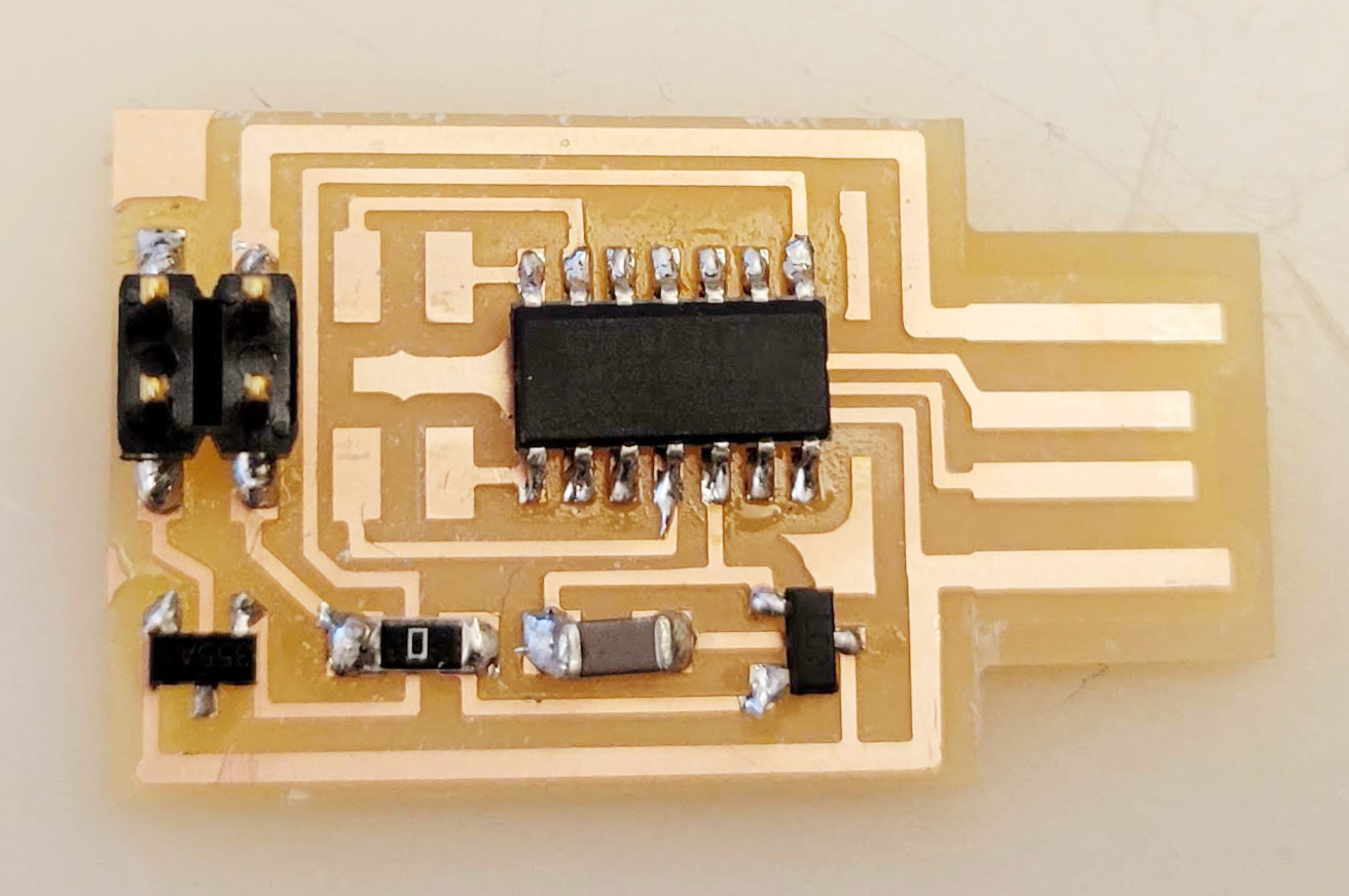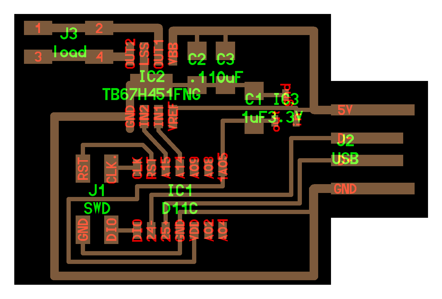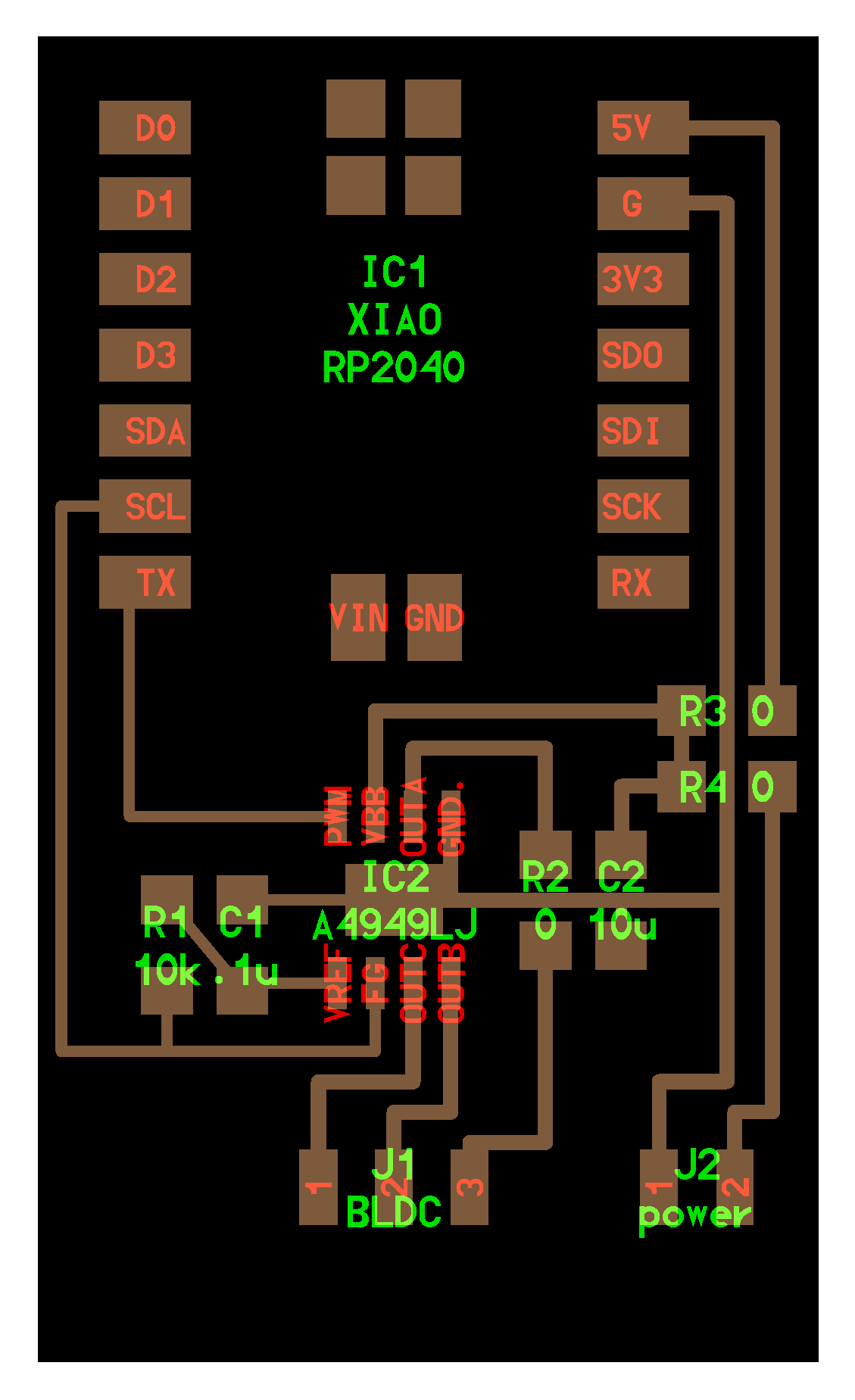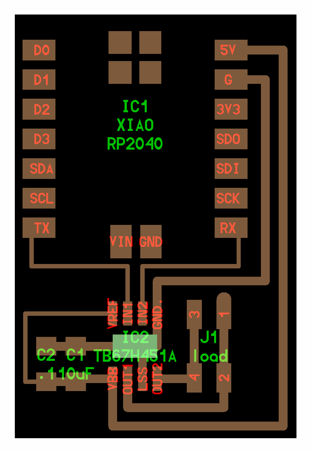 electrical safety ~1 mA: OK ~10 mA: shock, contraction ~100 mA: fibrillation body: M ohm external, k ohm internal dielectric breakdown: ~kV/mm supply capacitors inductive flyback polarity protection diode, MOSFET level shift MOSFET connector polarization, orientation circuit protection power wire gauge USB charger hub battery module meter power supply bench switching, linear, regulated supercapacitor LiPo battery charge controller storage wireless current measurement in-line meter supply regulation sense resistor magnetic field inductance LED current limiting hello.button-blink.C3 board components traces interior hello.button-blink.C3.ino hello.button-blink.C3.py video PWM hello.fade.C3.py video Charlieplexing hello.array.44 board components traces traces+exterior interior C makefile video hello.array.44.2 board components bottom vias top top+exterior interior C makefile video RGB LED pixels lights wires NeoPixel/WS2812B/SK6812 hello.WS2812B board components top interior hello.WS2812B.RP2040.py video Arduino Micropython library 3 in 1 hello.RGB.45 board components traces traces+exterior interior C makefile video LEDs diode drop, series-parallel MOSFET N, P, N floating gates, gate resistors dissipation, Rds, switching BJT, BiCMOS, IGBT hello.LEDs.t412 board components traces traces+exterior interior hello.LEDs.t412.ino video thermal runaway eye safety displays LCD HD44780 library hello.LCD.44 board components traces traces+exterior interior C makefile video I2C PCF8574 library hello.I2C.t1614 hello.LCD.I2C.ino video OLED SSD1306 hello.SSD1306.RP2040 board components top holes interior hello.SSD1306.RP2040.py ssd1306.py video library scripts hello.SSD1306.45 board components traces traces+exterior interior C makefile video TFT ILI9341 library hello.ILI9341.SW.D21E board components traces traces+exterior interior video hello.ILI9341.HW.D21E board components top top+exterior bottom holes interior video ST7735 video E Ink modules video RS170, NTSC, PAL, SECAM, VGA 75 ohm impedance hello.video.44 board components traces traces+exterior interior C makefile video SPI TVout thinner client color DC motor H-bridge TB67H451AFNG,EL TB67H453FNG(O,EL) hello.TB67H451.RP2040 board components top interior hello.TB67H451.RP2040.ino hello.TB67H451.RP2040.py boot.py video hello.H-bridge.D11C board components traces traces+exterior interior hello.H-bridge.D11C.ino video A4950 hello.H-bridge.44 board components traces traces+exterior interior C makefile video Dual H-bridge DRV8847 torque, power, efficiency, gearing vibration heat speaker MP3 module library hello.DFR0299.RP2040 pro sch pcb board components top holes interior hello.DFR0299.ino video I2S MAX98357A library module hello.MAX98357A.RP2040 board components top holes interior hello.MAX98357A.RP2040.ino video PWM class D, library hello.TB67H451.RP2040.audio.ino hello.TB67H451.RP2040.audio.py boot.py video hello.TB67H451.RP2040.wave.py sample.py hello.py convert_byterray.py video hello.TB67H451.RP2040.wave.ino sample.ino sample.main.ino convert.py video hello.speaker.D11C board components traces traces+exterior interior hello.speaker.D11C.ino hello.speaker-registers.D11C.ino video solenoid servo motor 50 Hz ~1-2 ms PWM (dis)continuous rotation ATtiny412 hello.servo.t412 board components traces traces+exterior interior hello.servo.t412.ino hello.servo-registers.t412.ino video ATSAMD11C hello.servo-D11C board components traces traces+exterior interior hello.servo-registers.D11C.ino video ATtiny44 hello.servo.44 board components traces traces+exterior interior ZLDO1117 hello.servo.44.1 board components traces traces+exterior interior LM2940 C (hardware PWM) makefile C (two-channel, software PWM) makefile video brushless DC motor (BLDC) efficiency, density, reliability, noise inrunner, outrunner, pancake, fan, gimbal Kv (RPM/V) phases/rotation (6 typical) drive waveform open-loop, closed-loop control back EMF (BEMF) sensing ~1 (fan), 10 (drone), 100 (skateboard), 1000 (car) A,$ triple half-bridge A4949 hello.A4949.RP2040 board components top interior hello.A4949.RP2040.py video electronic speed controller (ESC) hello.ESC.44 board components traces traces+exterior interior C makefile video firmware servo PWM power input, output initialization, calibration stepper motor types wire identification step size (1.8 degrees typical) full, half, microstepping current, duration field oriented control step and direction DRV8428 hello.DRV8428-D11C board components traces traces+exterior holes interior hello.DRV8428-D11C.ino video hello.DRV8428-D11C-NEMA17 board components traces traces+exterior holes interior code video H-bridge DRV8251ADDAR hello.DRV8251A.RP2040 pro sch pcb board components traces interior hello.DRV8251A.RP2040.stepper.ino video TB67H451AFNG,EL hello.stepper.bipolar.D11C board components top top+exterior bottom holes interior hello.stepper.bipolar.D11C.ino video driver electro-permanent electrostatic motor control Allegro TI Trinamic Pololu motion control solid state relay AC vs DC IC hockey puck wiring voltage drop: ~V safety: switch hot side US: black (red,blue) = hot, white = neutral, green(-yellow) = ground EU: brown (black,gray) = hot, blue = neutral, green-yellow = ground switched outlet shape memory piezo polymer artificial muscle fishing line conducting thread actuator LCE soft inflatable pneumatics hydraulics Lingdong group assignment: • measure the power consumption of an output device individual assignment: • add an output device to a microcontroller board you've designed, and program it to do something