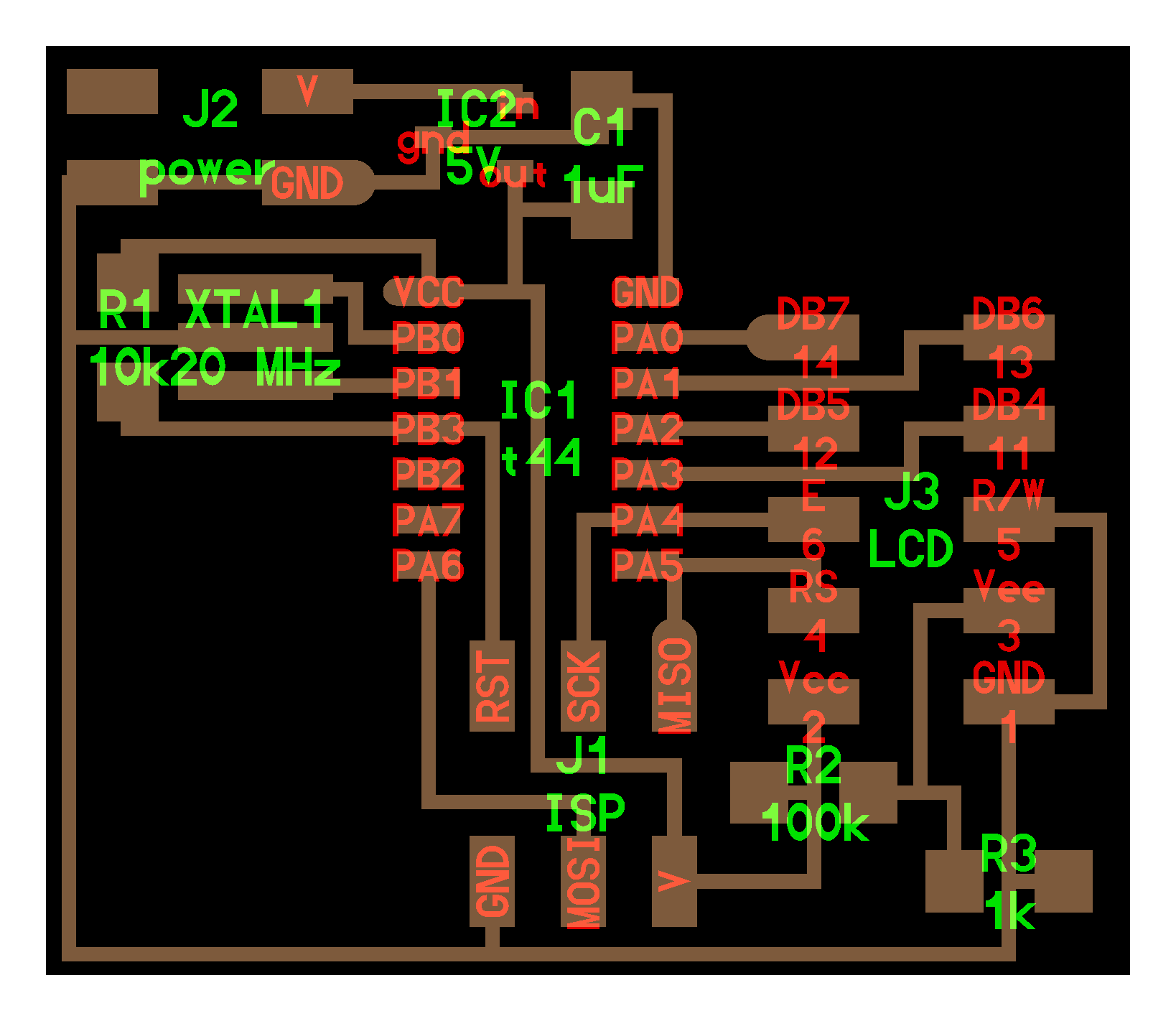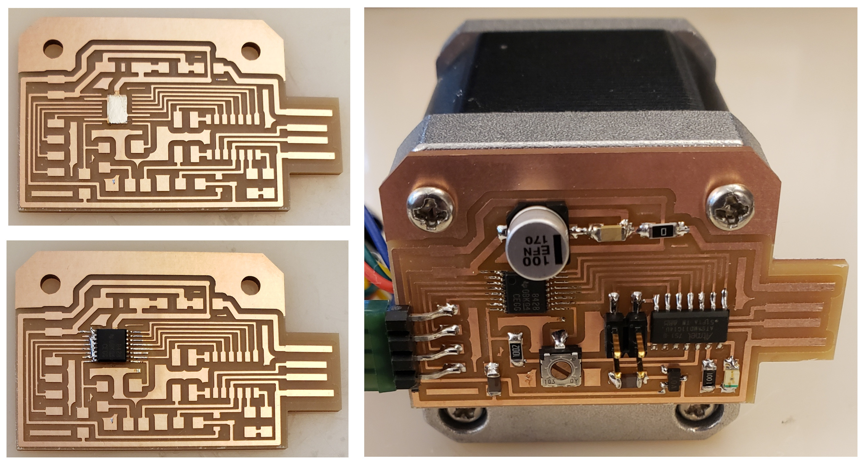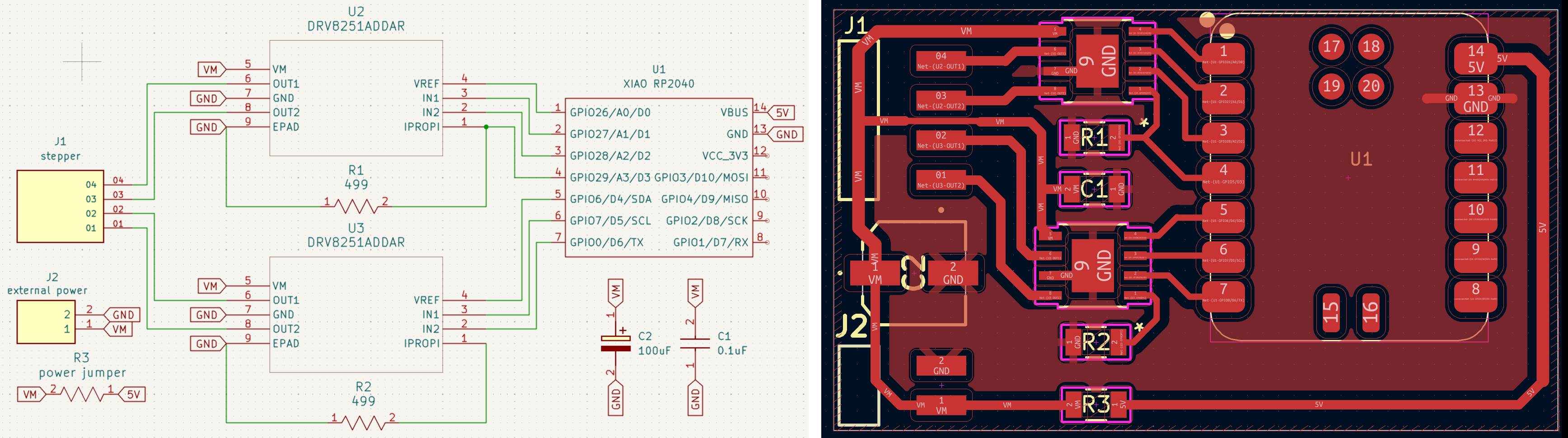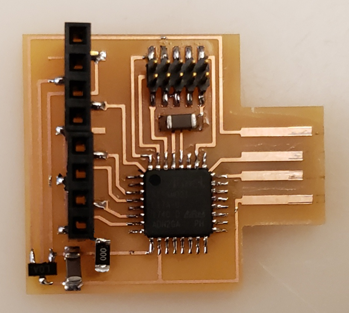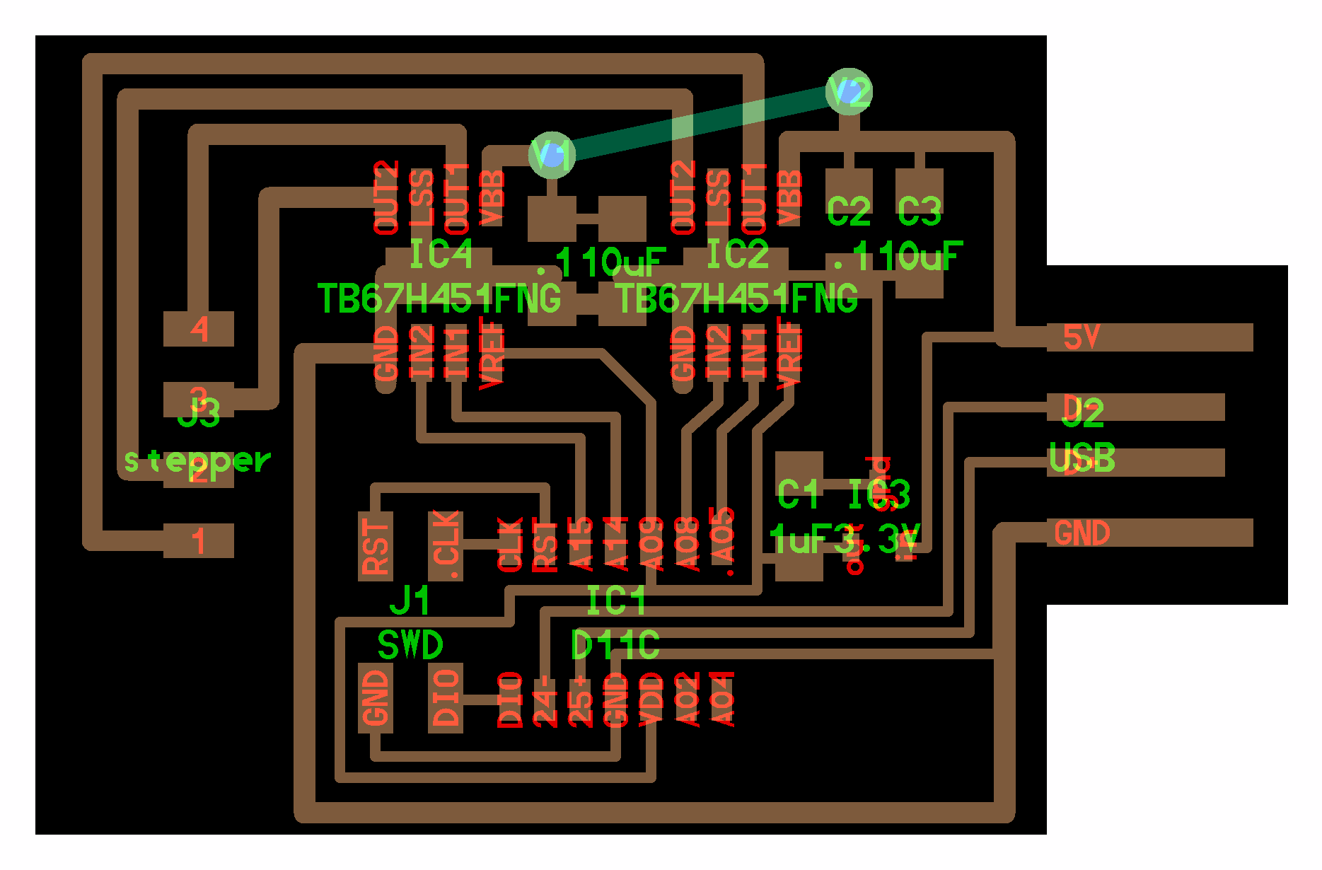 electrical safety ~1 mA: OK ~10 mA: shock, contraction ~100 mA: fibrillation body: M ohm external, k ohm internal dielectric breakdown: ~kV/mm supply capacitors inductive flyback polarity protection diode, MOSFET level shift MOSFET connector polarization, orientation circuit protection power wire gauge USB charger hub battery module meter power supply bench switching, linear, regulated supercapacitor LiPo battery charge controller storage wireless current measurement in-line meter supply regulation sense resistor magnetic field inductance LED current limiting hello.button-blink.C3 board components traces interior hello.button-blink.C3.ino hello.button-blink.C3.py video PWM hello.fade.C3.py video Charlieplexing hello.array.44 board components traces traces+exterior interior C makefile video hello.array.44.2 board components bottom vias top top+exterior interior C makefile video RGB LED pixels lights wires NeoPixel/WS2812B/SK6812 hello.WS2812B board components top interior hello.WS2812B.RP2040.py video Arduino Micropython library 3 in 1 hello.RGB.45 board components traces traces+exterior interior C makefile video LEDs diode drop, series-parallel MOSFET N, P, N floating gates, gate resistors dissipation, Rds, switching BJT, BiCMOS, IGBT hello.LEDs.t412 board components traces traces+exterior interior hello.LEDs.t412.ino video thermal runaway eye safety displays LCD HD44780 library hello.LCD.44 board components traces traces+exterior interior C makefile video I2C PCF8574 library hello.I2C.t1614 hello.LCD.I2C.ino video OLED SSD1306 hello.SSD1306.RP2040 board components top holes interior hello.SSD1306.RP2040.py ssd1306.py video library scripts hello.SSD1306.45 board components traces traces+exterior interior C makefile video TFT ILI9341 library hello.ILI9341.SW.D21E board components traces traces+exterior interior video hello.ILI9341.HW.D21E board components top top+exterior bottom holes interior video ST7735 video E Ink modules video RS170, NTSC, PAL, SECAM, VGA 75 ohm impedance hello.video.44 board components traces traces+exterior interior C makefile video SPI TVout thinner client color DC motor H-bridge TB67H451AFNG,EL TB67H453FNG(O,EL) hello.TB67H451.RP2040 board components top interior hello.TB67H451.RP2040.ino hello.TB67H451.RP2040.py boot.py video hello.H-bridge.D11C board components traces traces+exterior interior hello.H-bridge.D11C.ino video A4950 hello.H-bridge.44 board components traces traces+exterior interior C makefile video Dual H-bridge DRV8847 torque, power, efficiency, gearing vibration heat speaker MP3 module library hello.DFR0299.RP2040 pro sch pcb board components top holes interior hello.DFR0299.ino video I2S MAX98357A library module hello.MAX98357A.RP2040 board components top holes interior hello.MAX98357A.RP2040.ino video PWM class D, library hello.TB67H451.RP2040.audio.ino hello.TB67H451.RP2040.audio.py boot.py video hello.TB67H451.RP2040.wave.py sample.py hello.py convert_byterray.py video hello.TB67H451.RP2040.wave.ino sample.ino sample.main.ino convert.py video hello.speaker.D11C board components traces traces+exterior interior hello.speaker.D11C.ino hello.speaker-registers.D11C.ino video solenoid servo motor 50 Hz ~1-2 ms PWM (dis)continuous rotation ATtiny412 hello.servo.t412 board components traces traces+exterior interior hello.servo.t412.ino hello.servo-registers.t412.ino video ATSAMD11C hello.servo-D11C board components traces traces+exterior interior hello.servo-registers.D11C.ino video ATtiny44 hello.servo.44 board components traces traces+exterior interior ZLDO1117 hello.servo.44.1 board components traces traces+exterior interior LM2940 C (hardware PWM) makefile C (two-channel, software PWM) makefile video brushless DC motor (BLDC) efficiency, density, reliability, noise inrunner, outrunner, pancake, fan, gimbal Kv (RPM/V) phases/rotation (6 typical) drive waveform open-loop, closed-loop control back EMF (BEMF) sensing ~1 (fan), 10 (drone), 100 (skateboard), 1000 (car) A,$ triple half-bridge A4949 hello.A4949.RP2040 board components top interior hello.A4949.RP2040.py video electronic speed controller (ESC) hello.ESC.44 board components traces traces+exterior interior C makefile video firmware servo PWM power input, output initialization, calibration stepper motor types wire identification step size (1.8 degrees typical) full, half, microstepping current, duration field oriented control step and direction DRV8428 hello.DRV8428-D11C board components traces traces+exterior holes interior hello.DRV8428-D11C.ino video hello.DRV8428-D11C-NEMA17 board components traces traces+exterior holes interior code video H-bridge DRV8251ADDAR hello.DRV8251A.RP2040 pro sch pcb board components traces interior hello.DRV8251A.RP2040.stepper.ino video TB67H451AFNG,EL hello.stepper.bipolar.D11C board components top top+exterior bottom holes interior hello.stepper.bipolar.D11C.ino video driver electro-permanent electrostatic motor control Allegro TI Trinamic Pololu motion control solid state relay AC vs DC IC hockey puck wiring voltage drop: ~V safety: switch hot side US: black (red,blue) = hot, white = neutral, green(-yellow) = ground EU: brown (black,gray) = hot, blue = neutral, green-yellow = ground switched outlet shape memory piezo polymer artificial muscle fishing line conducting thread actuator LCE soft inflatable pneumatics hydraulics Lingdong group assignment: • measure the power consumption of an output device individual assignment: • add an output device to a microcontroller board you've designed, and program it to do something