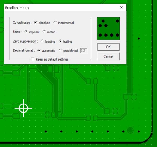 Now trying to open the drill files, CopperCam places holes in somewhat random place. Apparently I need the holes for the XIAO board to be attached to the board. After a few tries, I realized that by toggling the Units to Imperial then the holes where in their right place. The NPTH.drl-file is not opening at all, but it seems I don't need it.