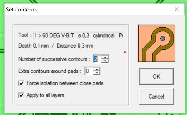 Next I clicked Calculate contours and now it shows that 60DEG V bit is used for isolation milling, and I got confirmed by lab assistant (and Gemini) that it's OK. I also set number of successive contours to 2 and extra contours around pads to 0 (to make the contours shallower than the previous ones printed here.) Also the other two options below are as supposed to.