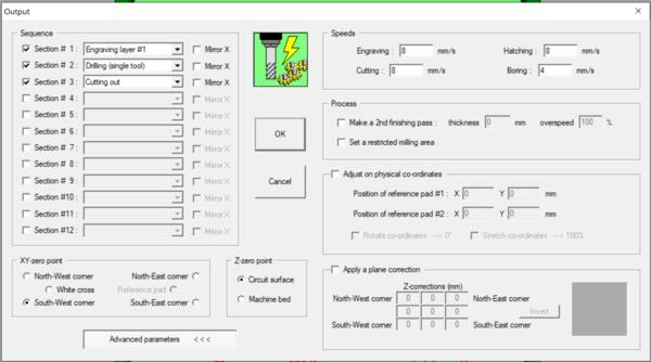 Then I'm ready to export toolpaths. I click Mill icon and check the sections, leave Mirror X unchecked and have the XY-zero point to South-West corner. Click OK and check that this resulted in two files for both engraving and cutting/drilling. Getting here took me almost 4 hours and I need to leave the lab now, so I continue the actual milling tomorrow.