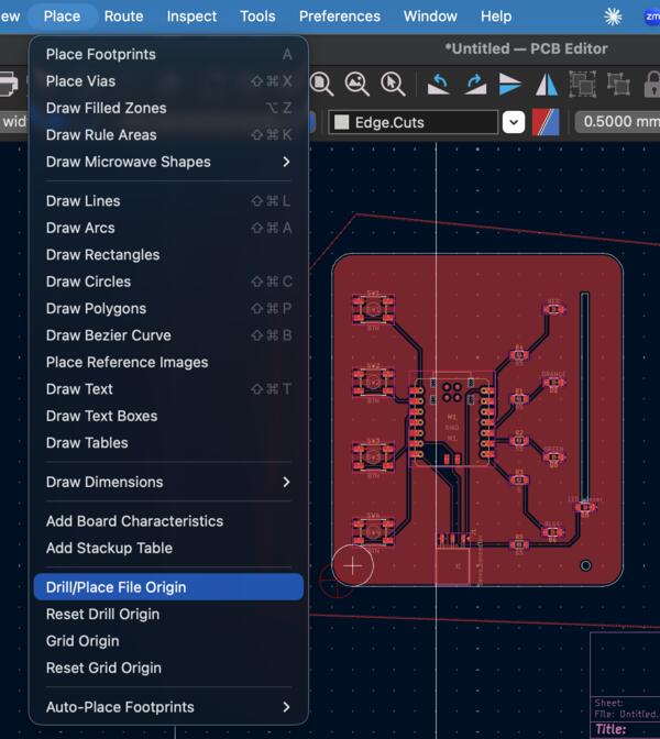 Around a few more corners, I select Place -> Drill/Place File Origin and set the origin in the bottom left corner of the board. Exporting to gerbers, I selected Use drill/place file origin. Also Gemini instructed me to generate Drill files (which I hadn't done previously) and select Origin: Drill/Place file origin.