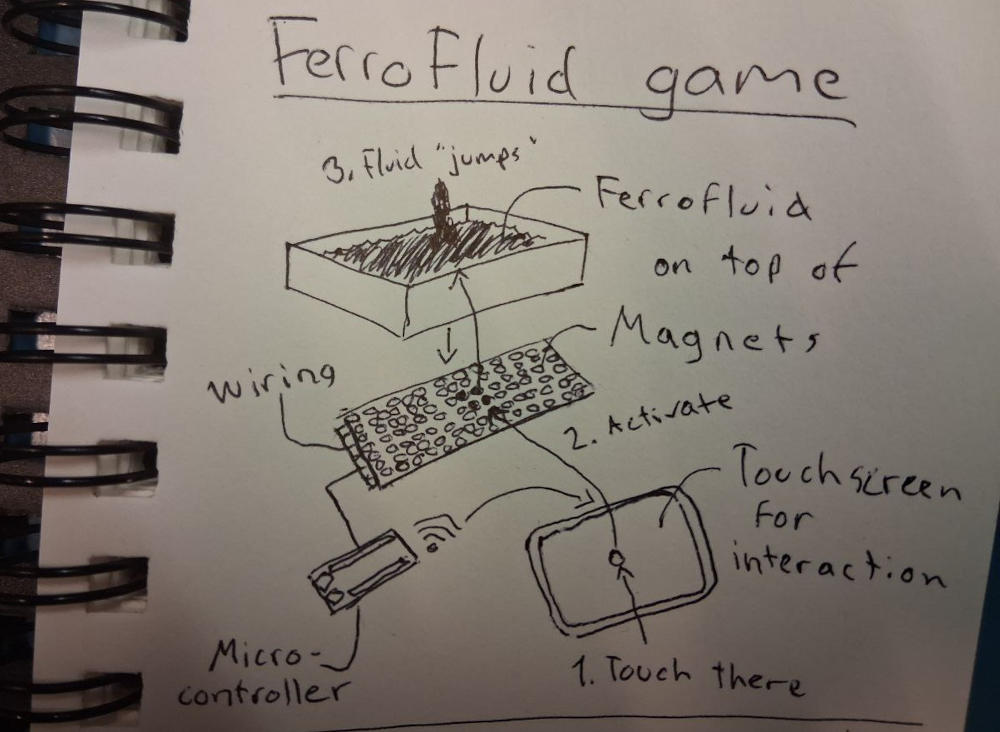 Small ferrofluid/magnetorheological container on top of a area of small magnets. Put many small electromagnets next to each other and place a container on top of them and pour of ferrofluid in it. The magnets can be programmed to go on and off, thus making the fluid react by going up and down. This would allow interaction with ferrofluid, for example with touch screen computer/tablet, so that what you press becomes magnetized in the area of magnets making the fluid react to the user’s hand.