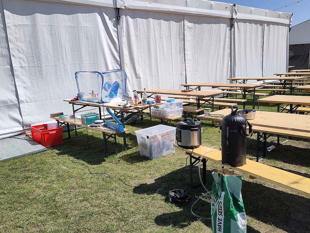 During that event, I want to explore more biohacking with mushroom. So we setup a mini biolab (campsite) and tried differents techniques. And discover that warm sun situation aren’t ideal.