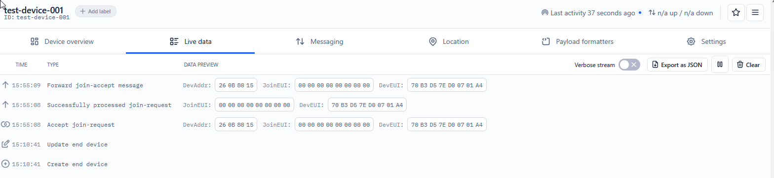 If you have access to a TTN gateway (if you own the gateway and can see messages going through), you’ll be able to see the join process. In the gateway tab you have a console like interface .