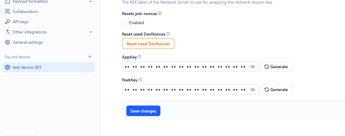 Be aware this is for prototyping. You’ll do many mistake. For security reason and cryptography there is a counter in LoRaWAN protocol. We have to disable that feature for testing. On your end device configuration page please check “Resets join nonces enable” by clicking on “Reset used DevNonces” .