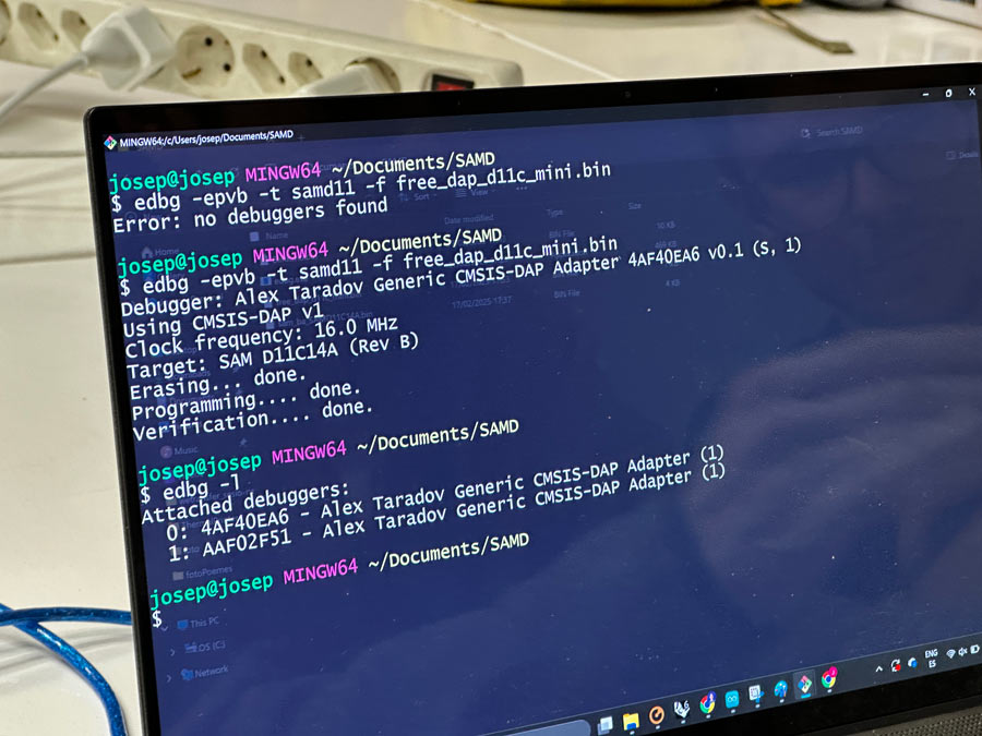 I then sanity checked by plugging the USB power cable feeding the ESP32 Barduino to a power supply to make sure (for my own understanding) that it was truly being programmed purely via the SAMD 4 pin serial cable and not the USB.