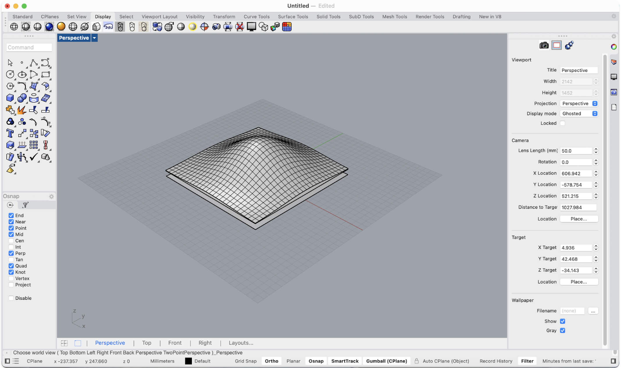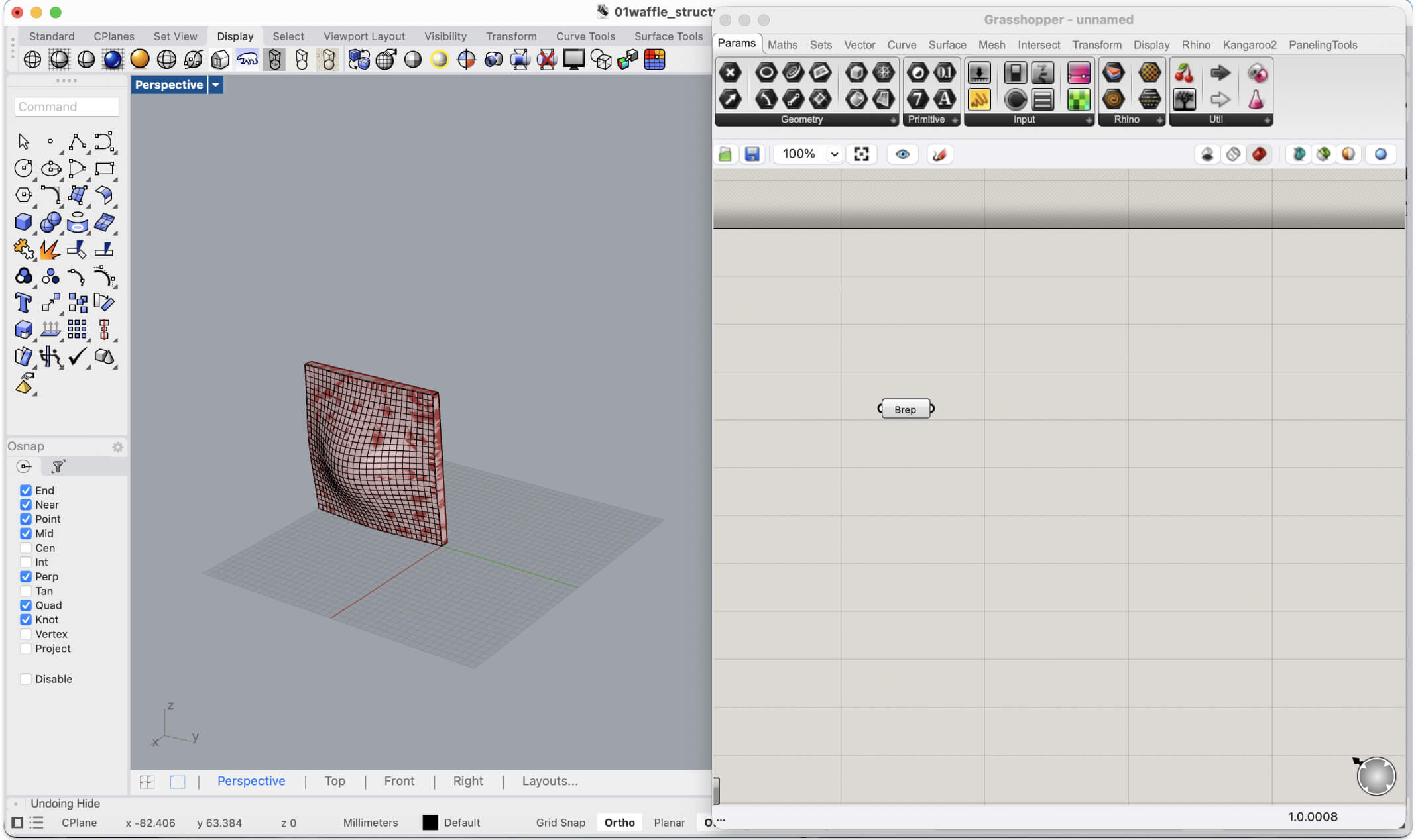 The goal was to design a lamp based on an interlocking "waffle" structure, featuring an organic central bump. This "bump", initially modeled in Rhino as a NURBS surface, is not just an aesthetic choice, but serves as the main structural core where the interlocking joints (and kerf calculations) will be concentrated.