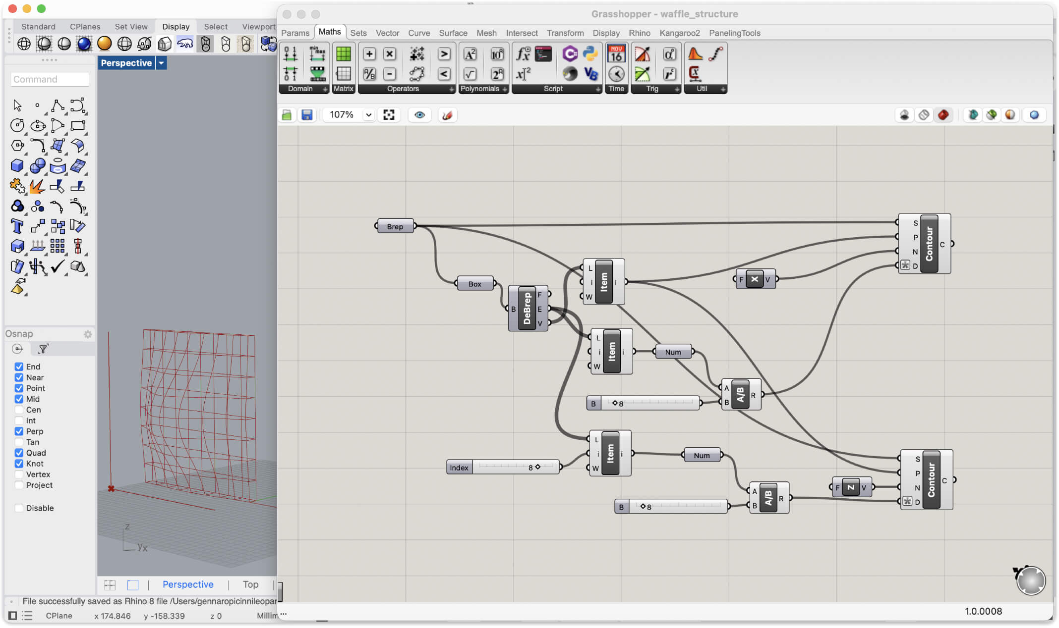 After importing the geometry into Grasshopper, I used the Contour component to slice it along two orthogonal axes. Thanks to numeric sliders, I can dynamically control the grid density and the distance between the cutting planes, instantly generating the framework for the joints without any manual redrawing.