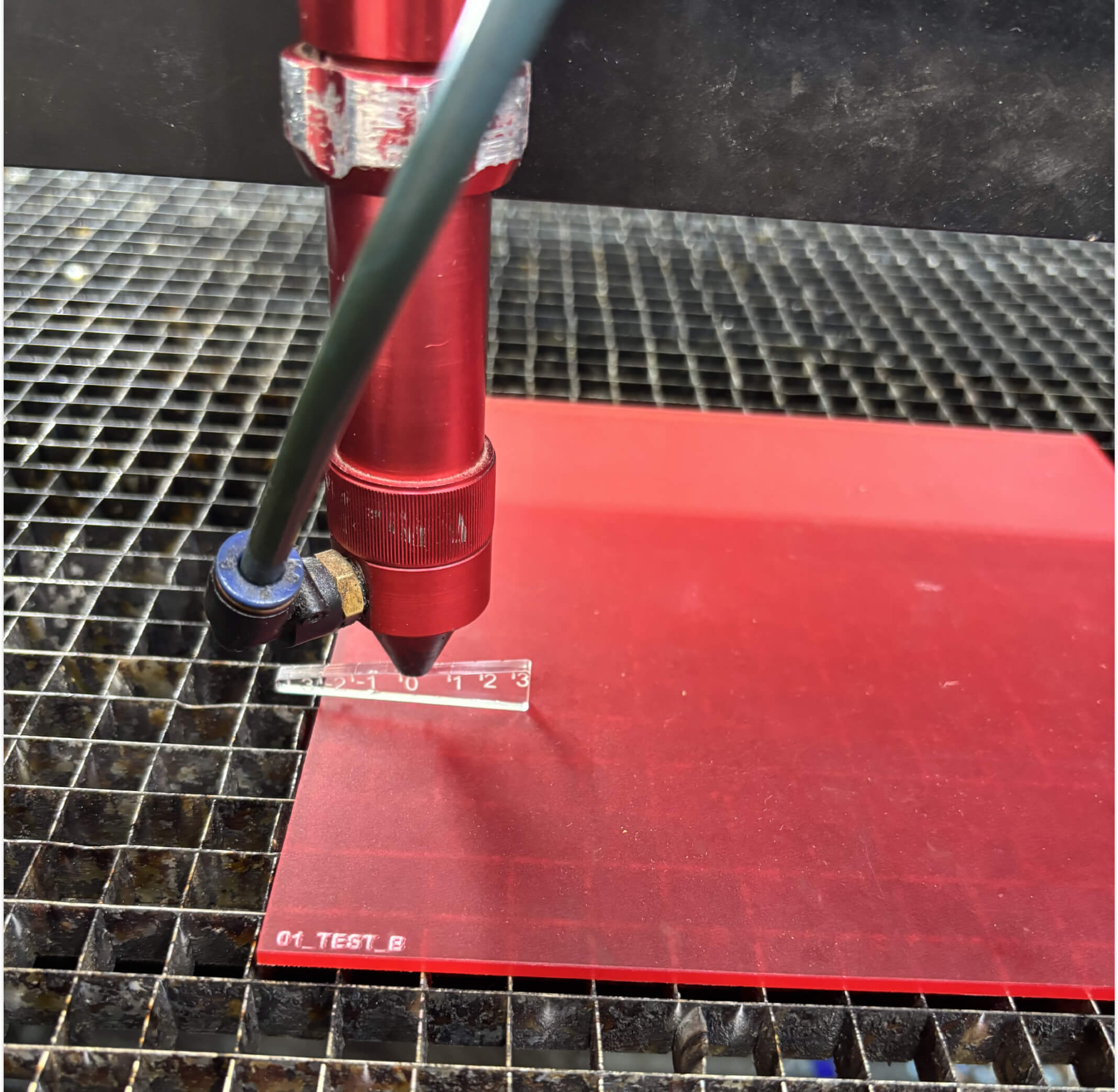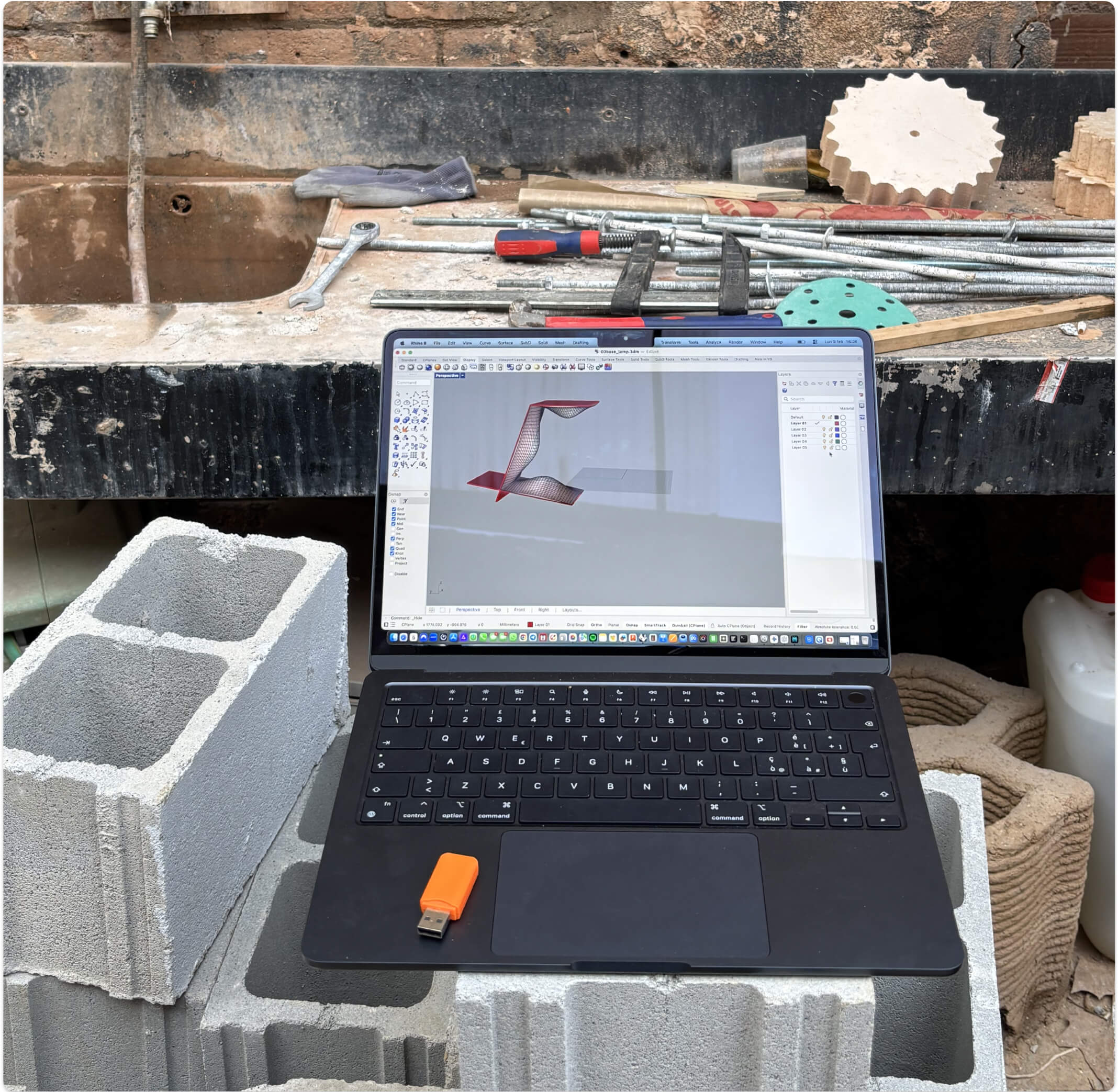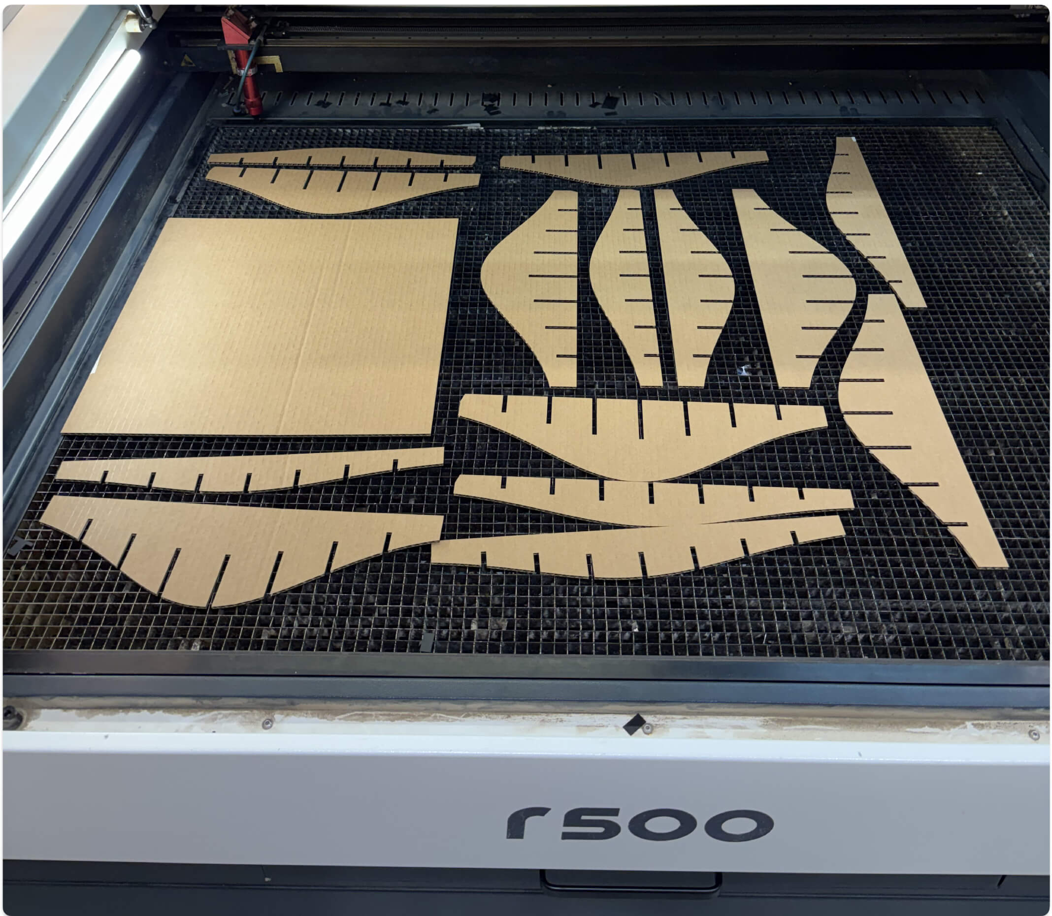 Once the parametric design was ready, I extracted the 2D profiles and nested them to prepare the cutting layout in Rhino. I placed a sheet of corrugated cardboard into the Rayjet R500 and launched the first test.