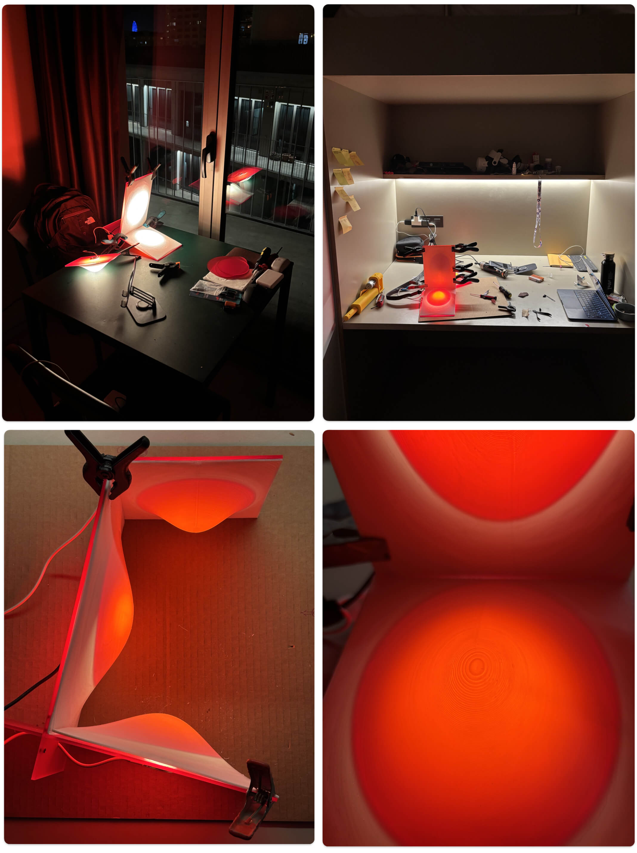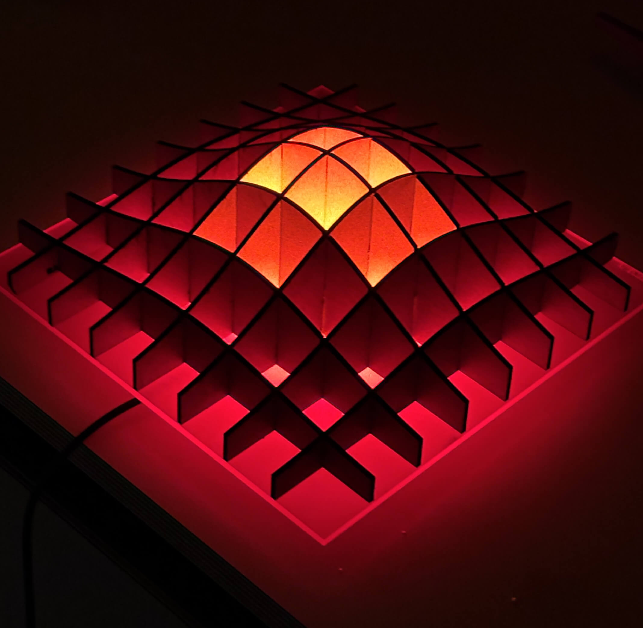For the materials, I envisioned a mix: wood for the main interlocking kerf structure, a 3mm red acrylic sheet I found at a local hardware store, and matte white 3D printed covers to act as light diffusers over the bumps. Testing the light through these elements and the waffle structure was incredible. It was an amazing feeling to realize I could use a 3D printer, a laser cutter, and do lighting tests all in the exact same day.