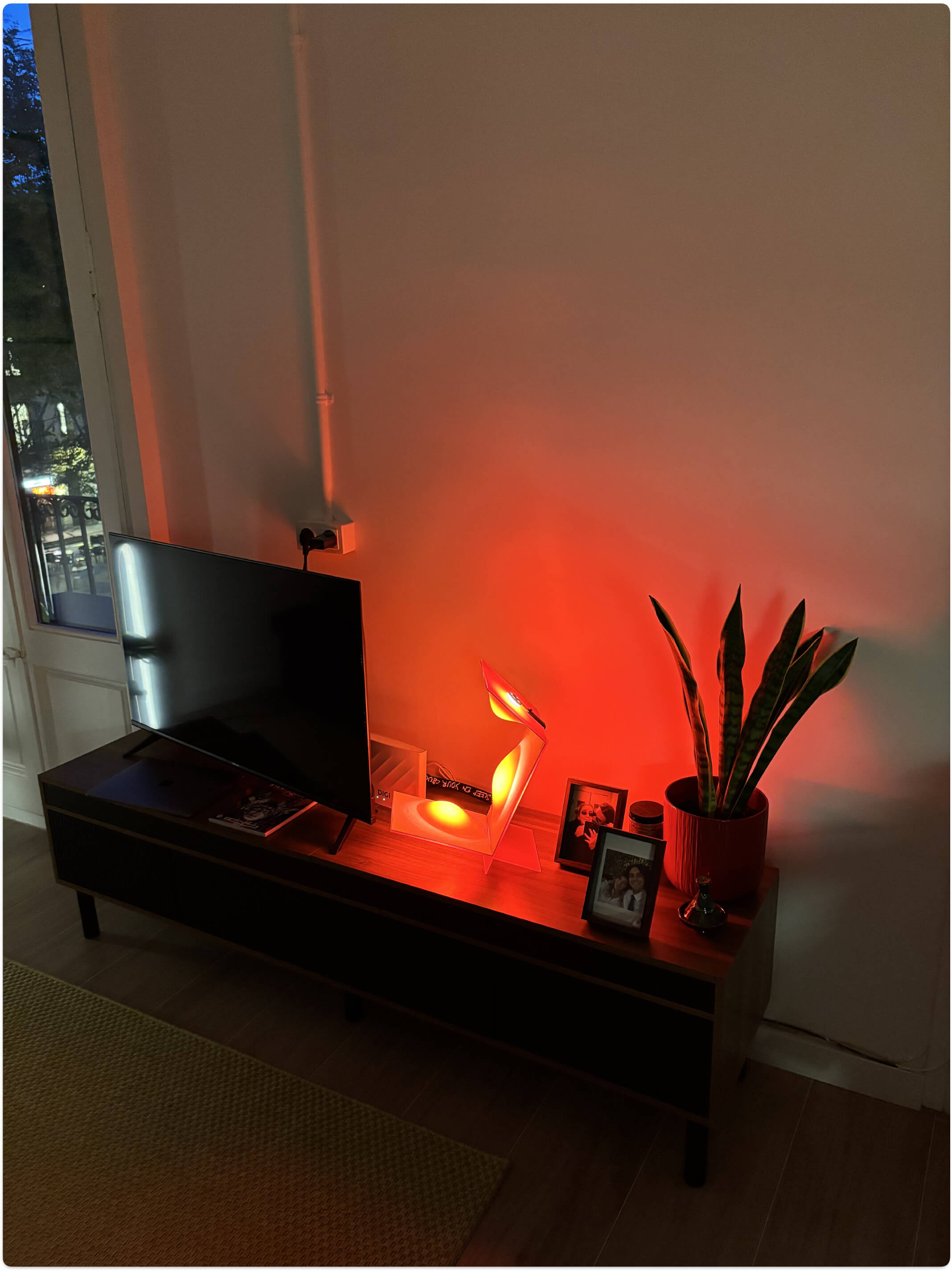 Then, I had a brilliant realization: since it runs on USB, I could hook it up to a power bank. This meant I could surprise my friend Luigi by delivering the lamp to him fully lit up, right in the middle of the street! Seeing him completely happy and caught off guard with this glowing red object was a fantastic payoff. Finally, I got to see the lamp in its new habitat, lighting up his living room with its warm, intense vibe.