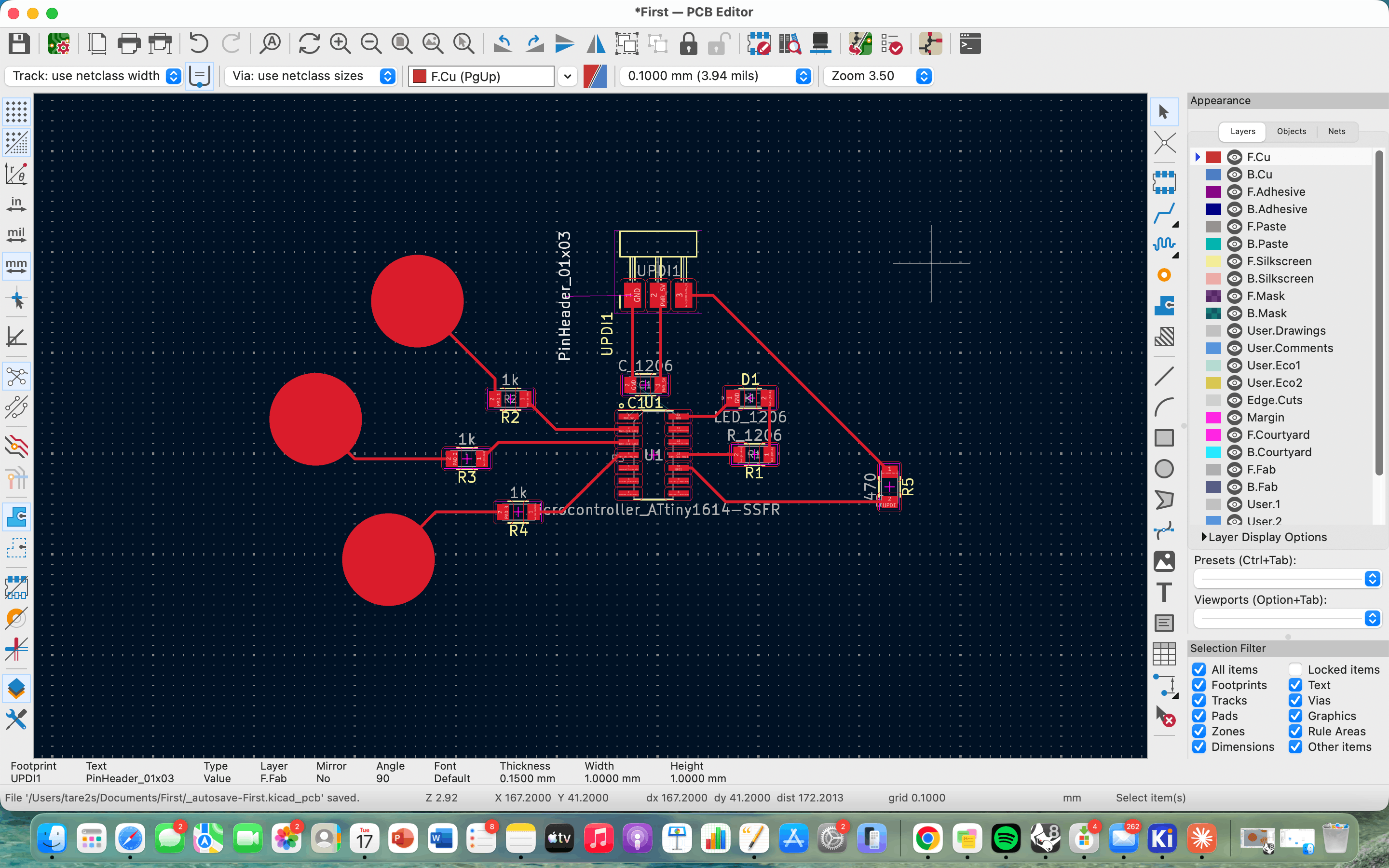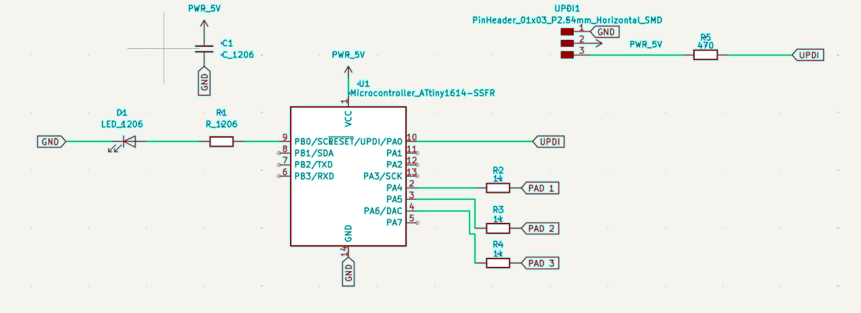 Power (pins 1 & 14) — VCC gets 5V from USB, GND connects to the shared ground rail. Straightforward. Touch pads (pins 2, 3, 4 — PA4, PA5, PA6) — these three are part of the ATtiny 1614’s built-in PTC (Peripheral Touch Controller) peripheral. This is the key insight: you do NOT need a separate send/receive pair per pad. Each of these pins can sense capacitance directly on its own. One pin, one pad. This simplifies your circuit significantly compared to what you originally sketched. LED output (pin 9 — PB0) — any general-purpose I/O pin works for the LED. PB0 is a clean choice, away from the touch pins and easy to route on the PCB. UPDI programming (pin 13 — PA0) — this is the dedicated programming pin. It goes directly to your 3-pin header. One important note: PA0 is UPDI only — you cannot use it for anything else. Spare pins (5, 6, 7, 8, 10, 11, 12) — six pins completely free. Good news if you ever want to expand the project.