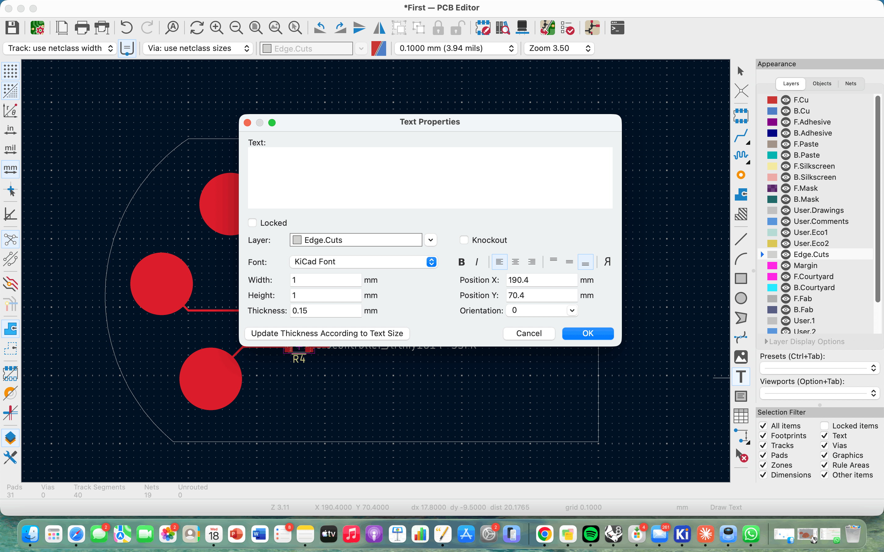 I drew the capacitive touch Pad using the circle command. Then by double clicking the circle to open the properties tab. I filled the circle with the fill tab. Then Relabel the circle to PAD 1. I did the same thing for the rest of PAD 2 and PAD 3.