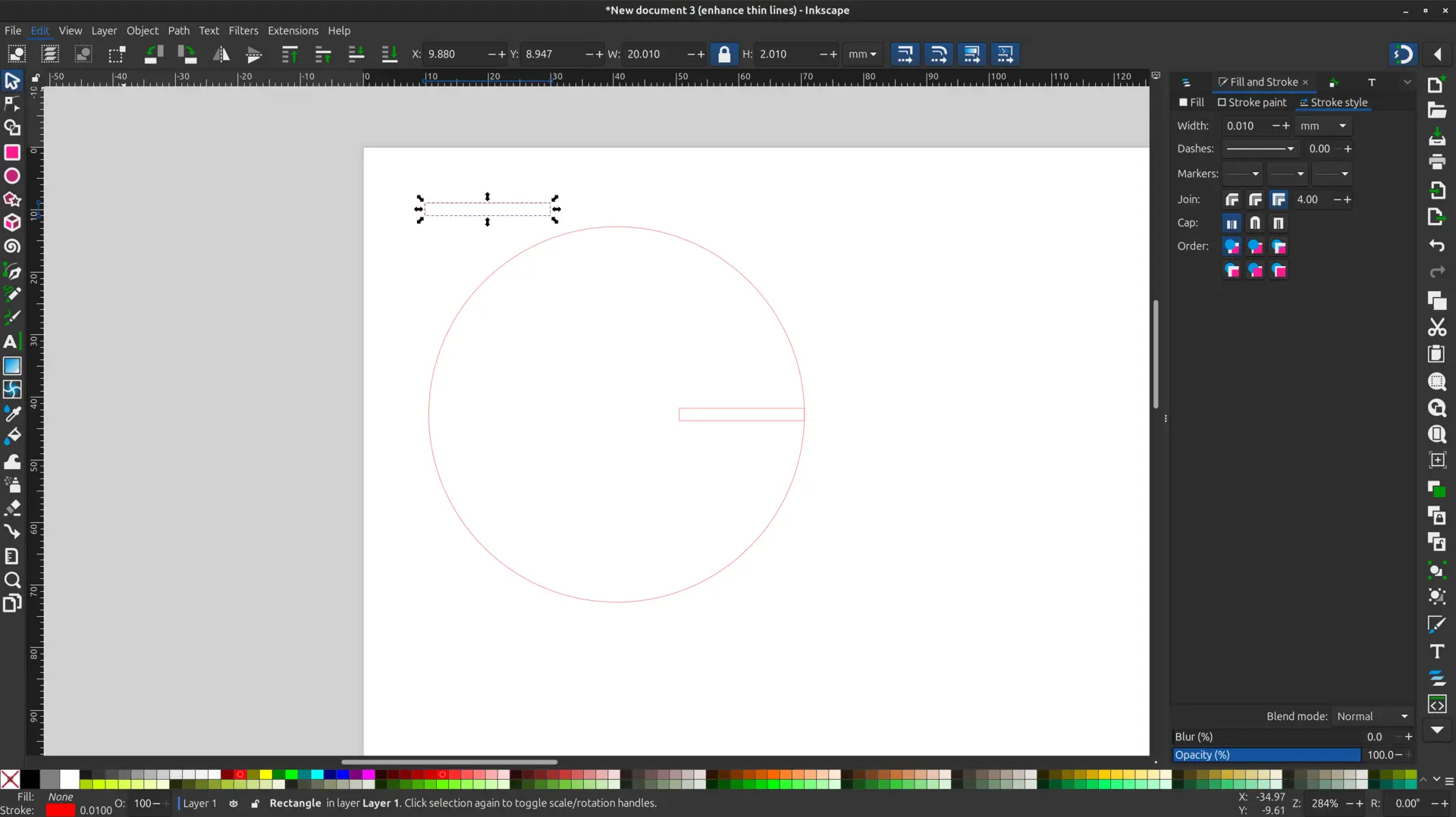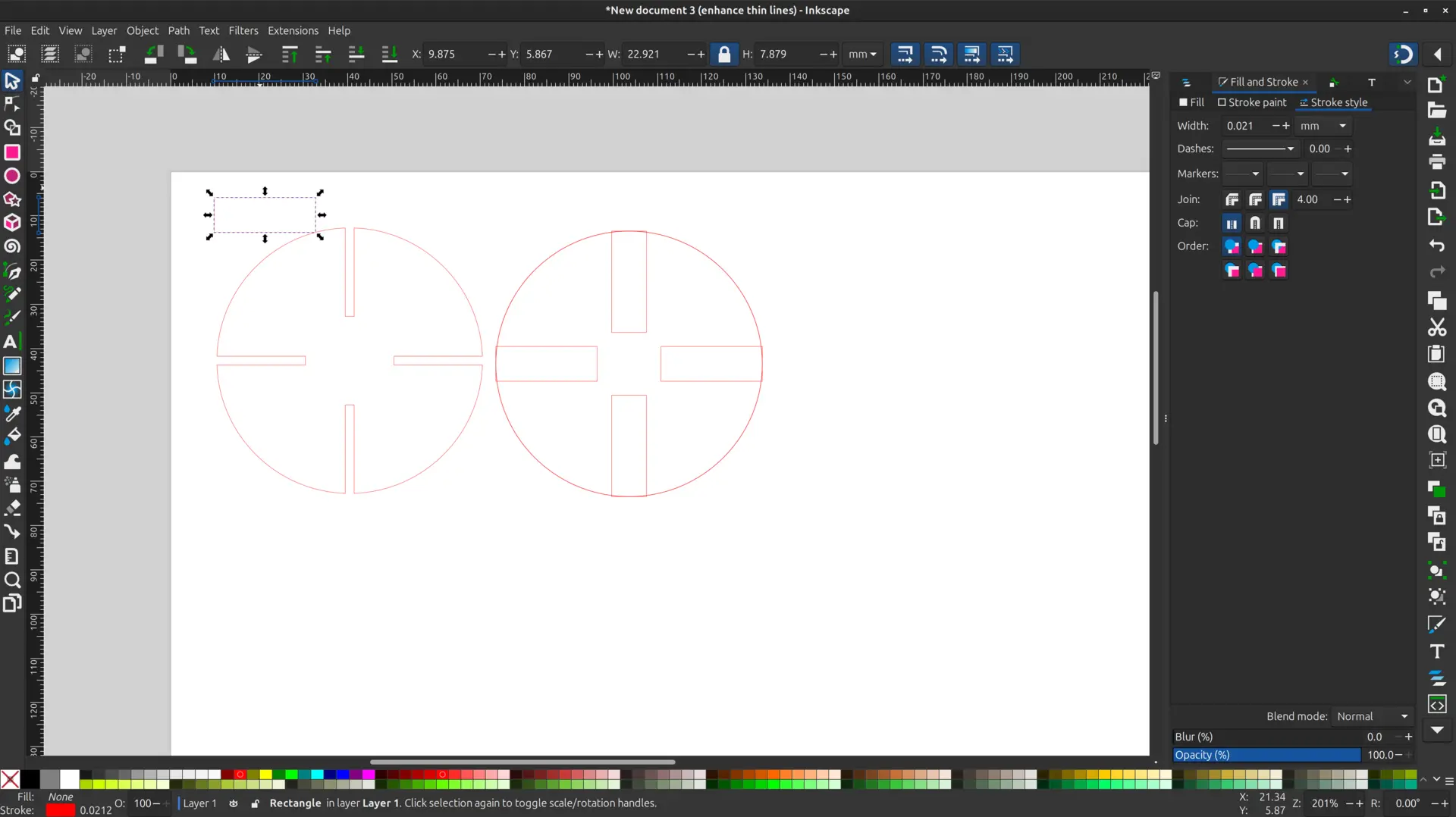 I also experimented with one of the shapes to subtract the rectangle from the circle to achieve a clean cut. This can be done by selecting the circle and the rectangle, and then selecting Path -> Difference as seen here: