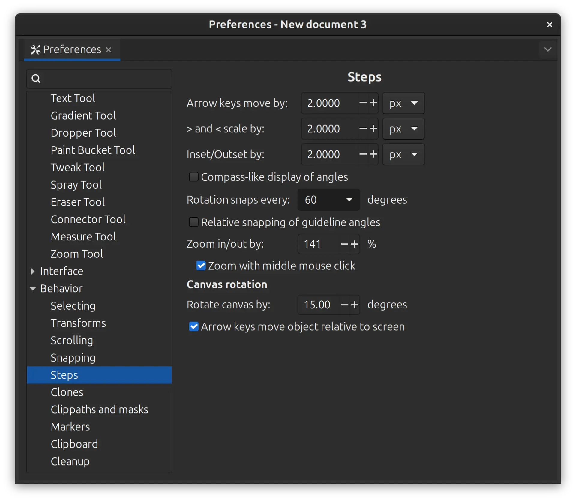 I then went into Edit -> Preferences -> Behavior -> Steps and changed the setting for Rotation snaps every __ degrees and changed it to the desired angle