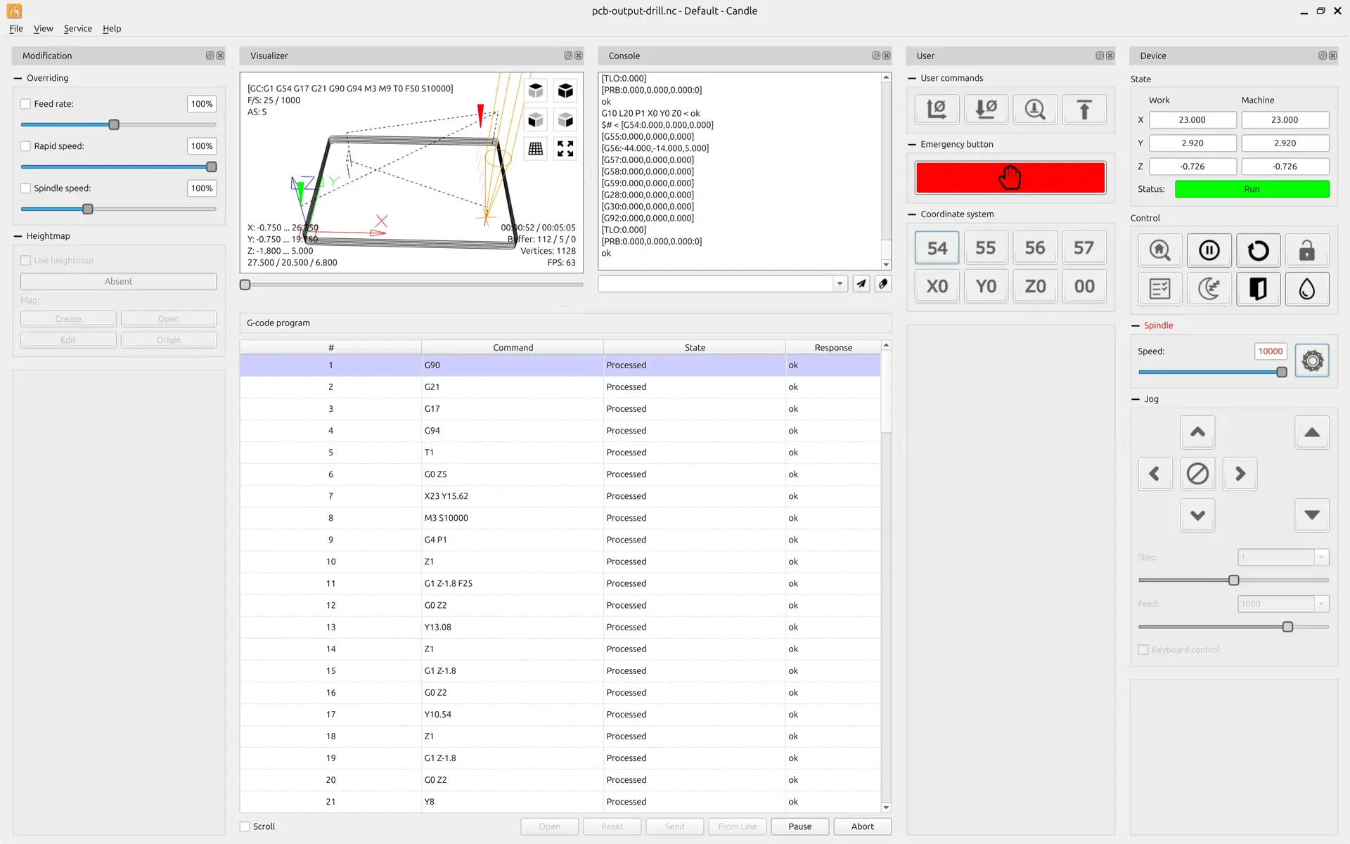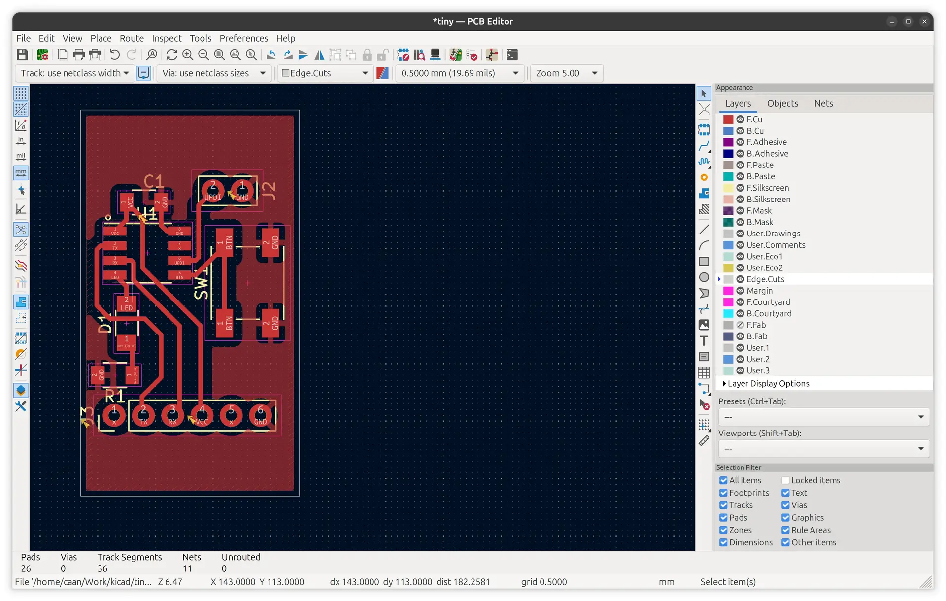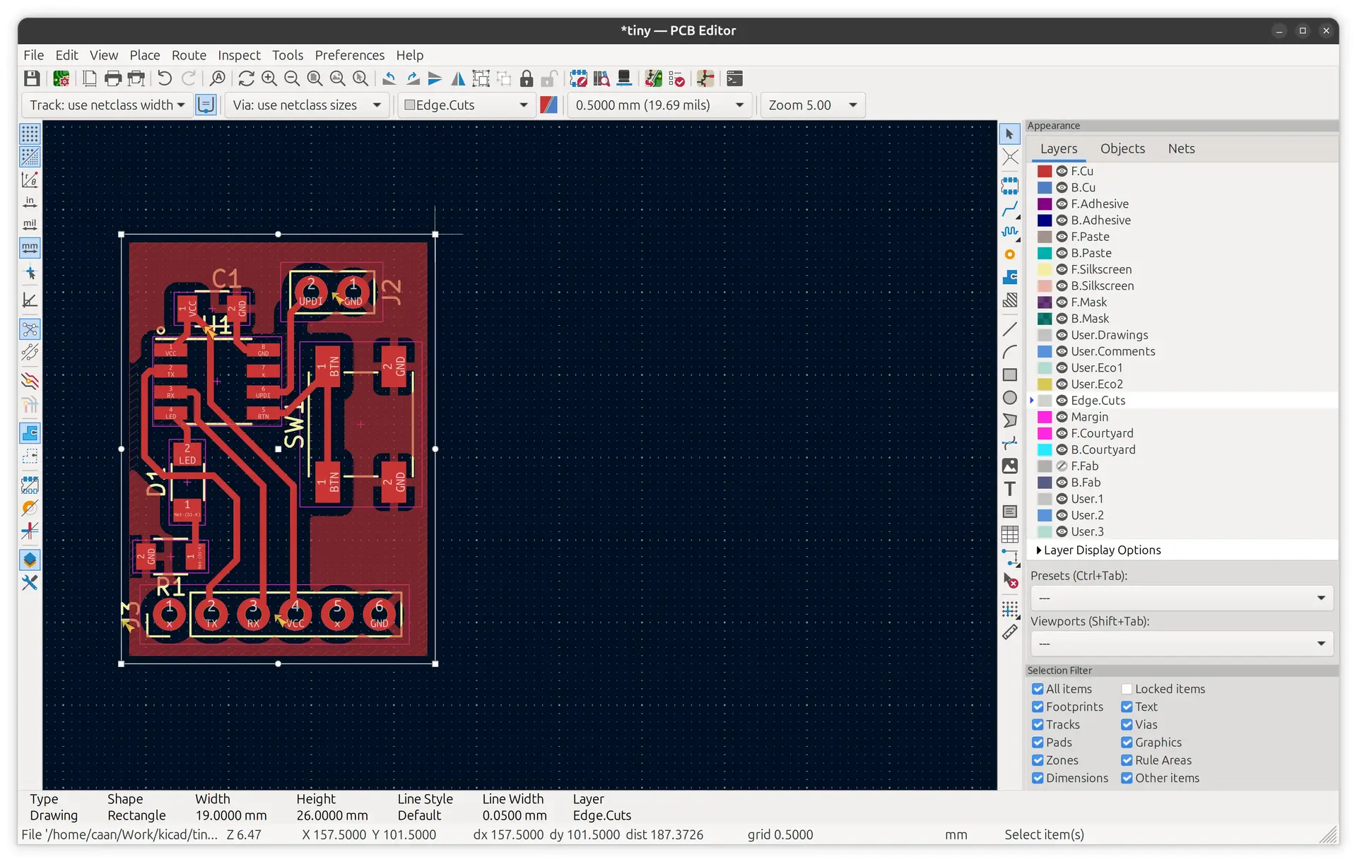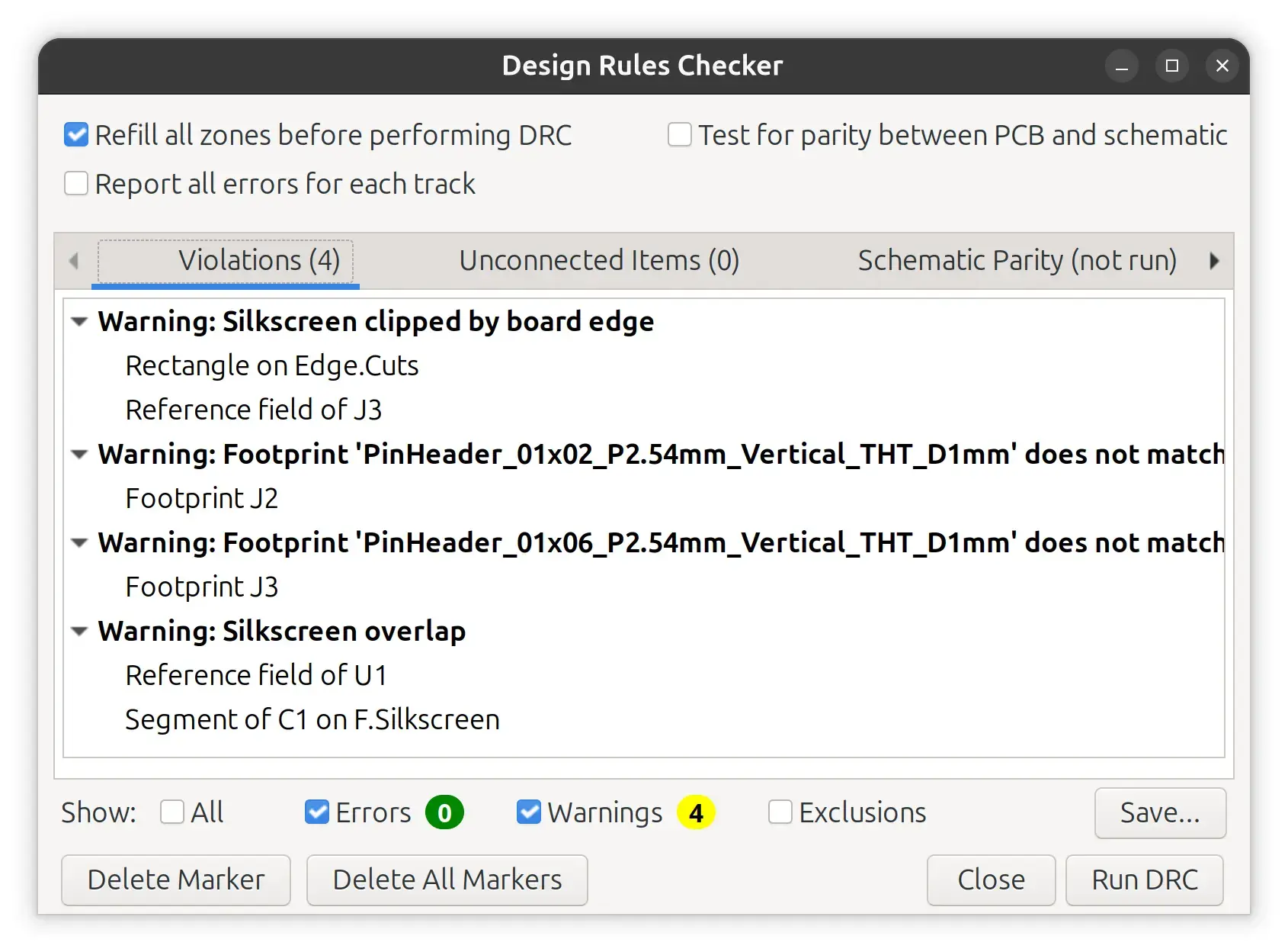 I ran the Design Rules check to make sure everything is OK, and we only have warnigs which are not important for the milling step: