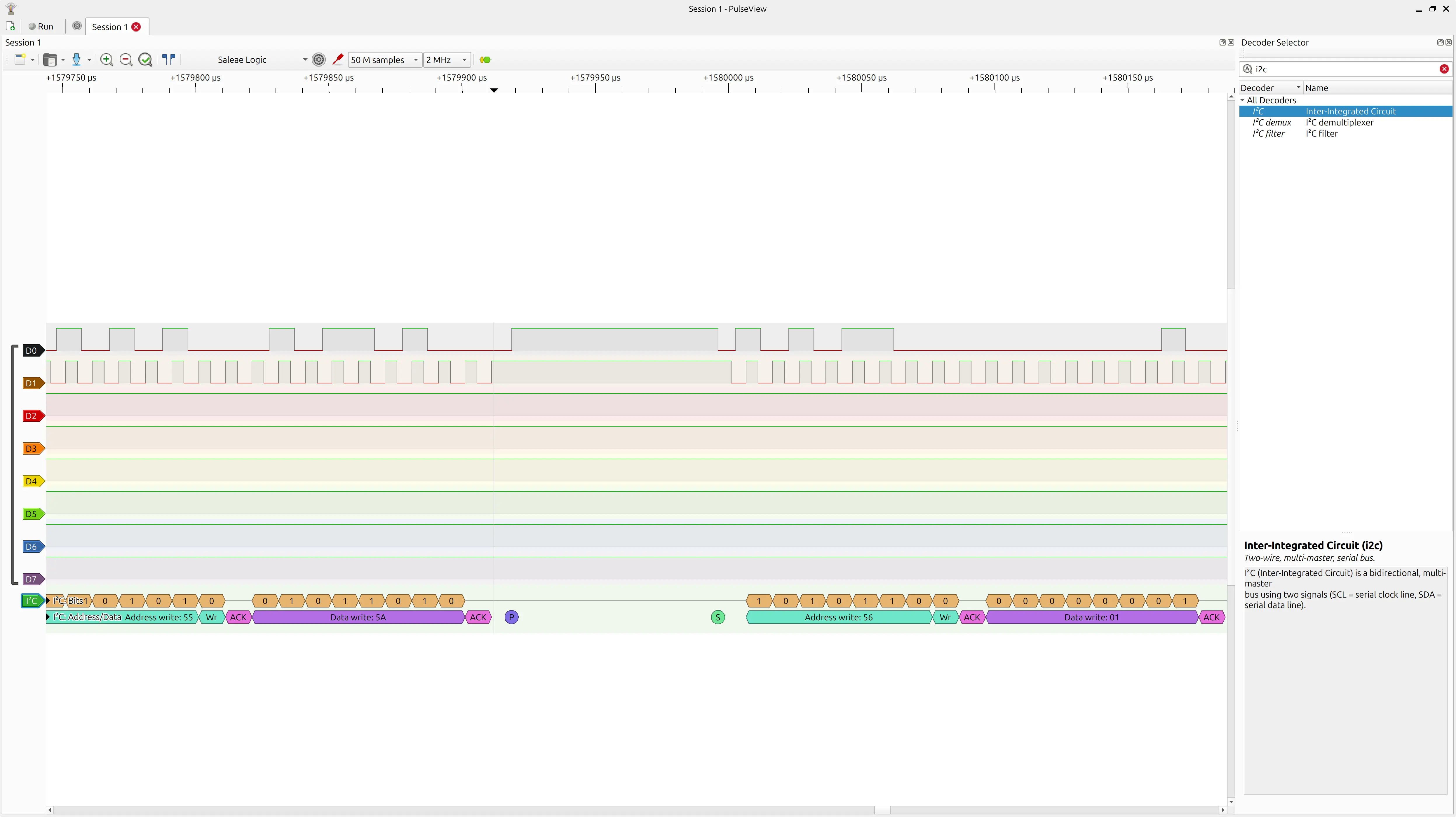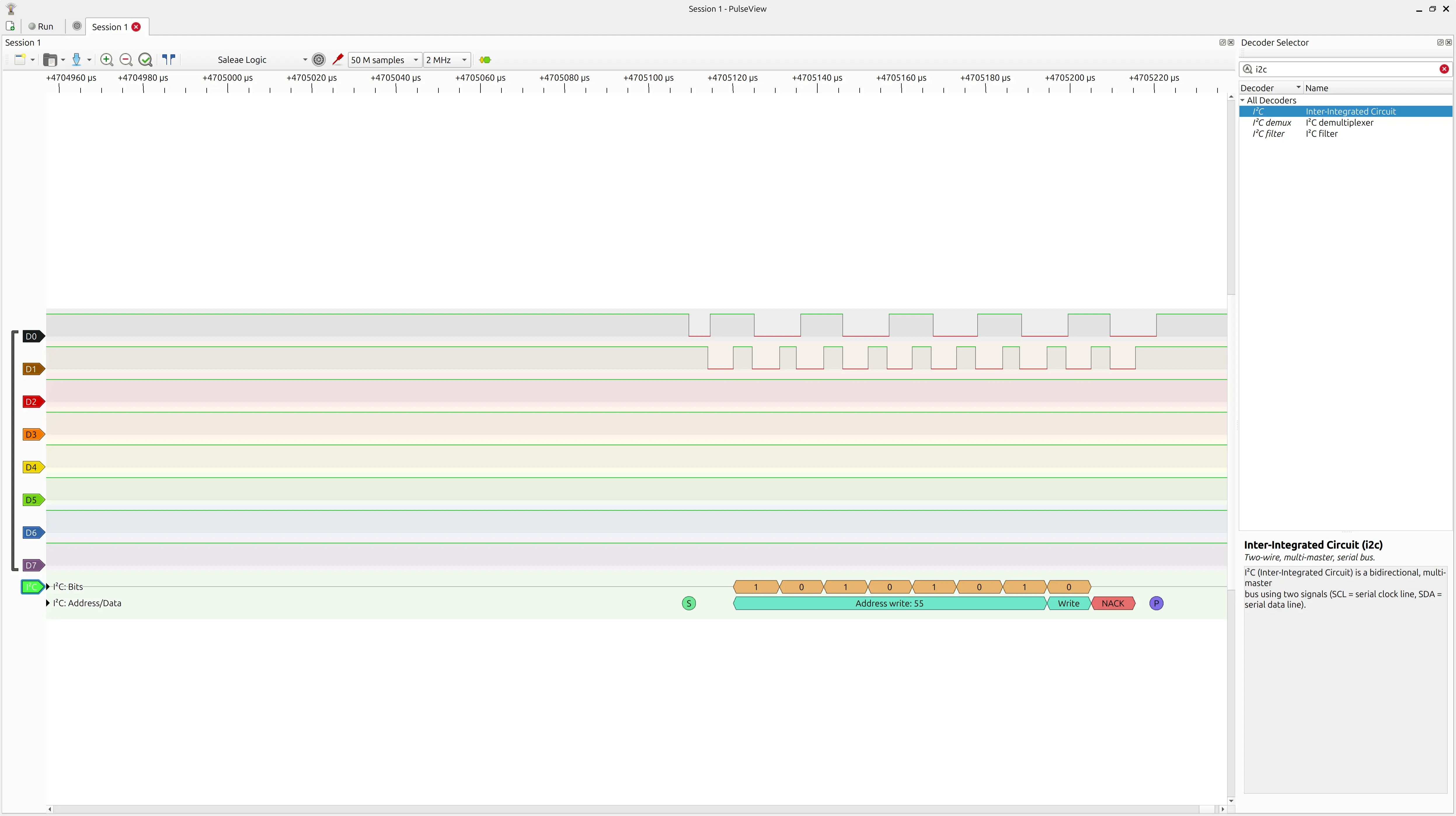 Once I changed the sample rate to 2 MHz and collected 50 M samples, I was able to see the addresses that WireScan was probing, so I switched back to my code and finally saw the 0x55 address that I had coded: