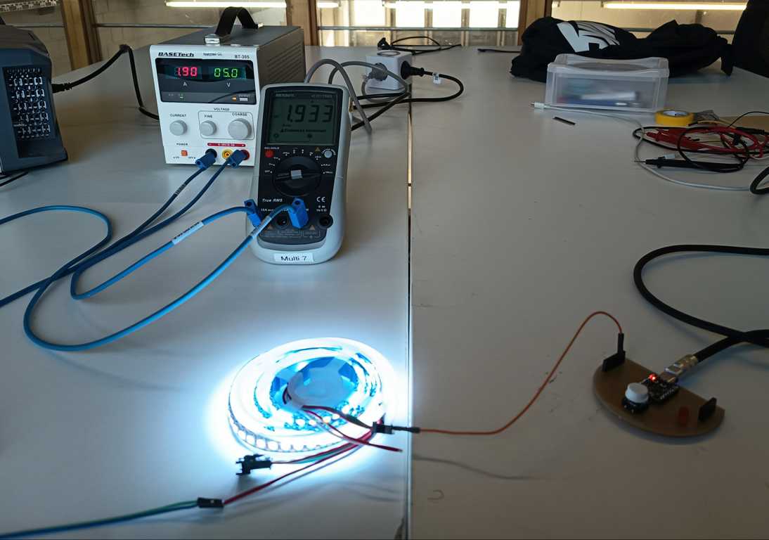 For the test, we set the LED strip so that all three color channels (red, green, and blue) were active at 100% brightness, which corresponds to a full white output and represents a high-load operating condition. To measure the current correctly, we connected a multimeter in series with the power supply line. This is important because current can only be measured accurately when the meter is placed directly in the current path of the circuit.