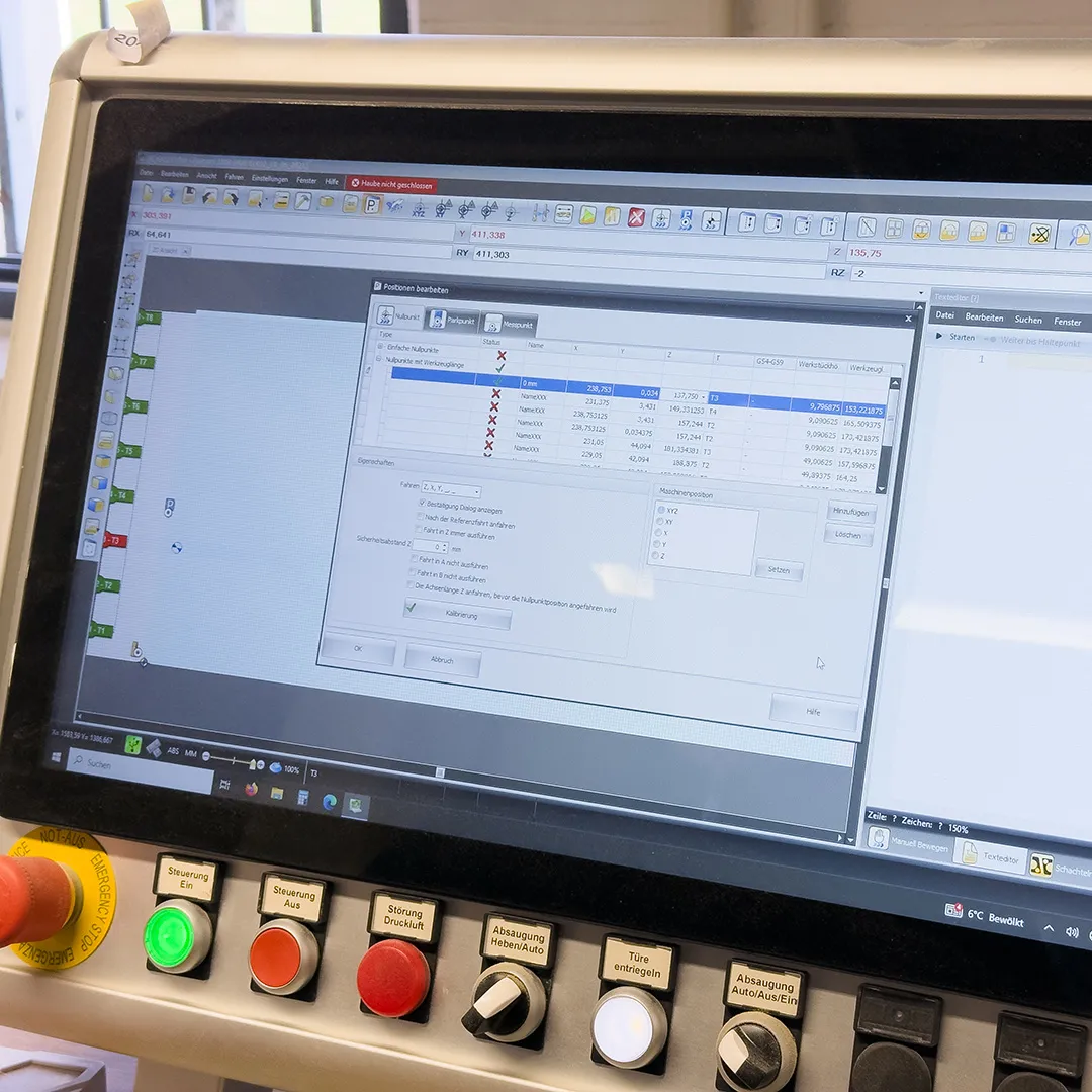 Before starting, especially with unknown results and untested parameters, we reviewed the CNC safety instructions and took note of emergency stops and fire extinguisher locations. Then the milling operation was started.