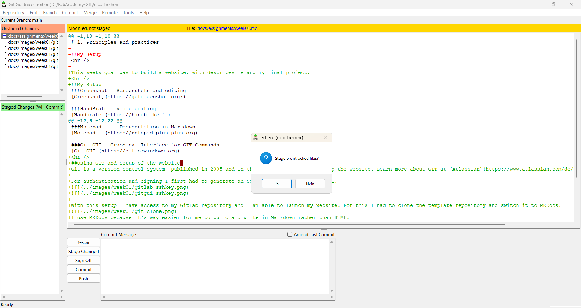 With this setup I have access to my GitLab repository and I am able to launch my website. For this I had to clone the template repository and switch it to MKDocs.