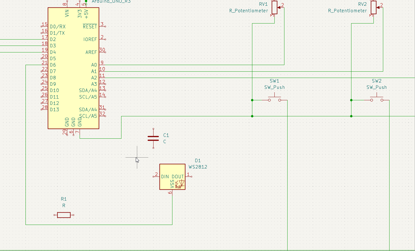 I used a breadboard, jumper cables, 3 buttons and 3 potentiometers. In addition I used a 200 Ohm resistor, wich protects the data line from voltage spikes and a 0,47 µF capacitor, wich stabilizes the power supply and prevents flickering.