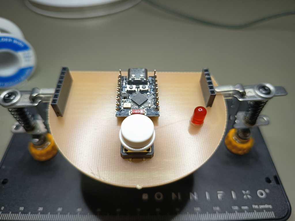 Therefore, I integrated a single LED with a 220 Ω resistor as a basic output and a [push button](https://www.snapeda.com/parts/VS-1213-67-160GF/Valcon/view-part/ as a digital input.