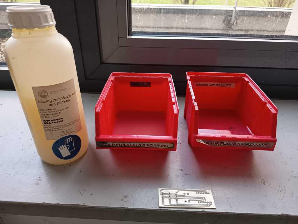 Afterwards, I submerged the PCB in a tinning solution to improve solderability and protect the copper surface.