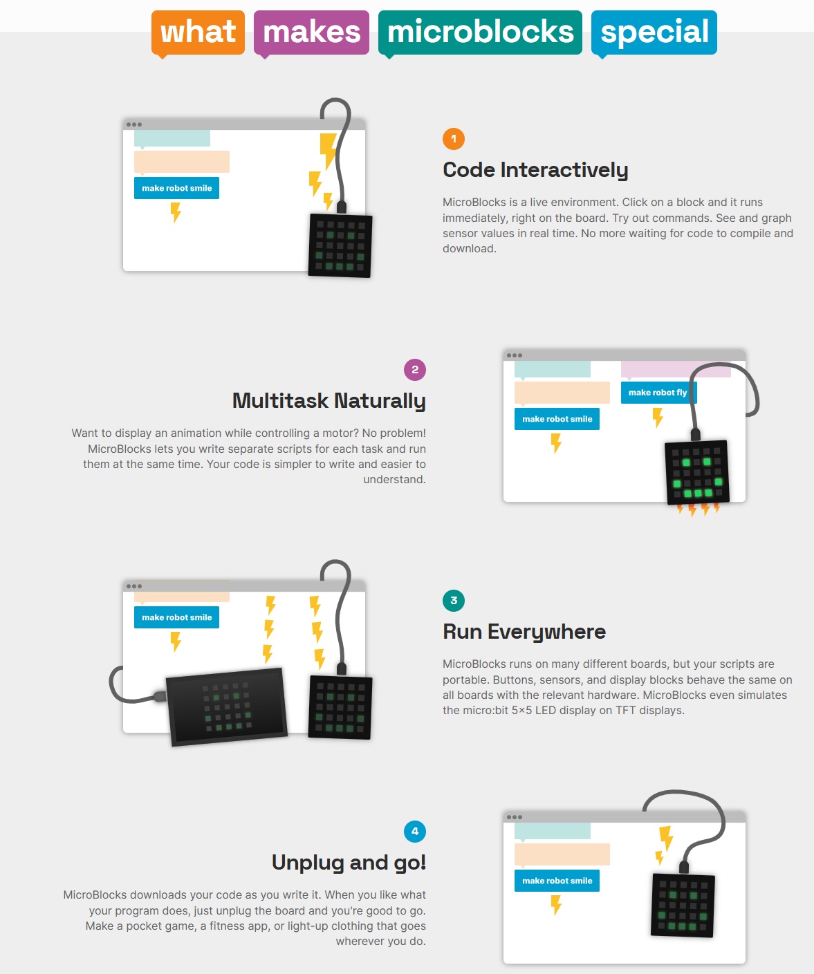MicroBlocks is a high-performance, visual block-based programming language. Unlike other block editors that translate to C and then compile, MicroBlocks runs a small virtual machine on the board, enabling live, parallel execution.