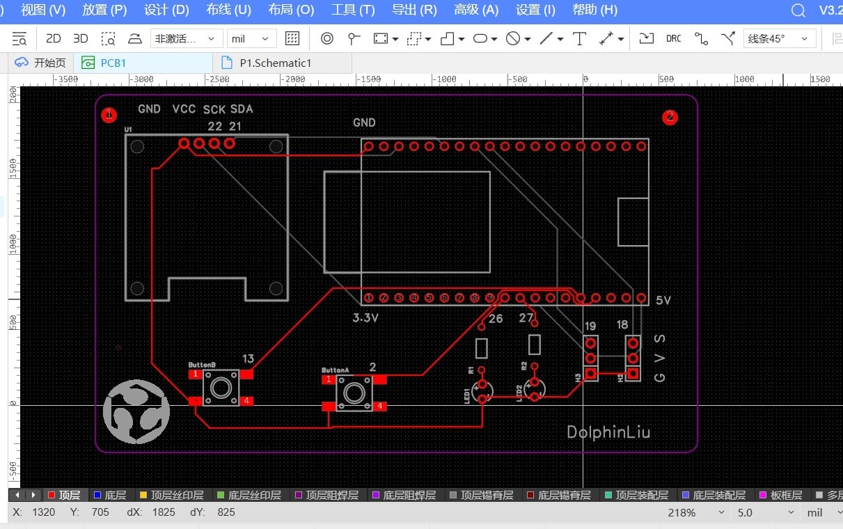 - I use "Route -> Auto Route... " to quickly complete the component routing, requiring only minor adjustments. I then reviewed and verified the routing on both the top and bottom layers. I added the logo and name.