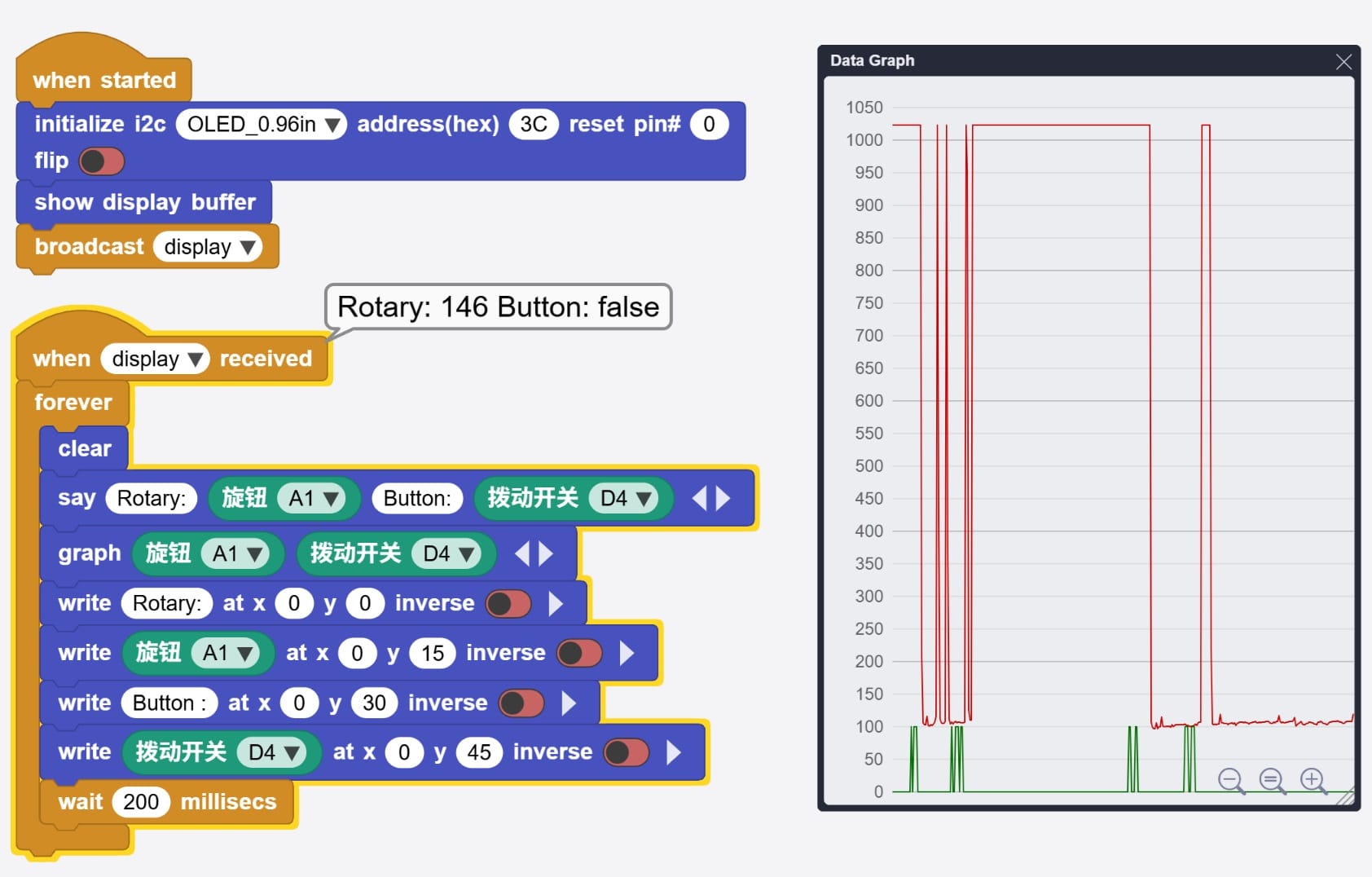 sayIt 'Rotary:' ('旋钮' 'A1') 'Button:' ('拨动开关' 'D4')
