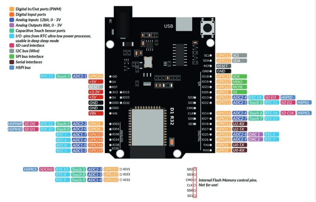Here is the ESP32 Uno D1 pinout :