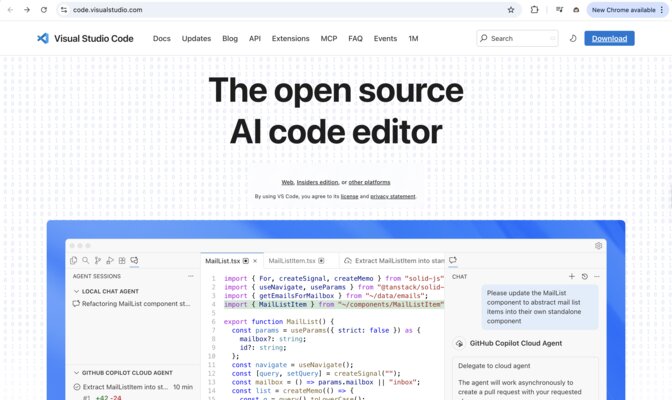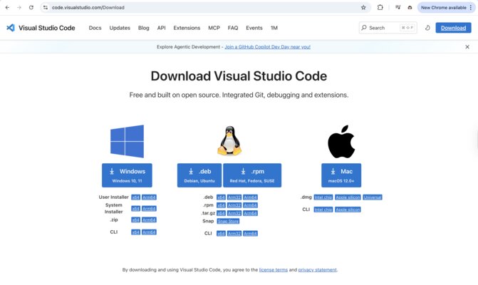 Visual Studio Code -> a free code editor made by Microsoft. Basically a workplace where you write and edit code. It can work with many languages (Python, JavaScript, C++, etc), has built-in Git support and clean interface.