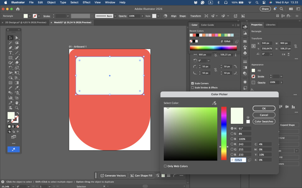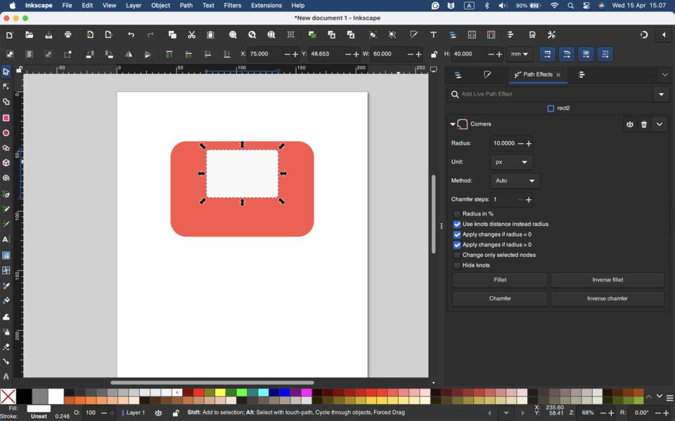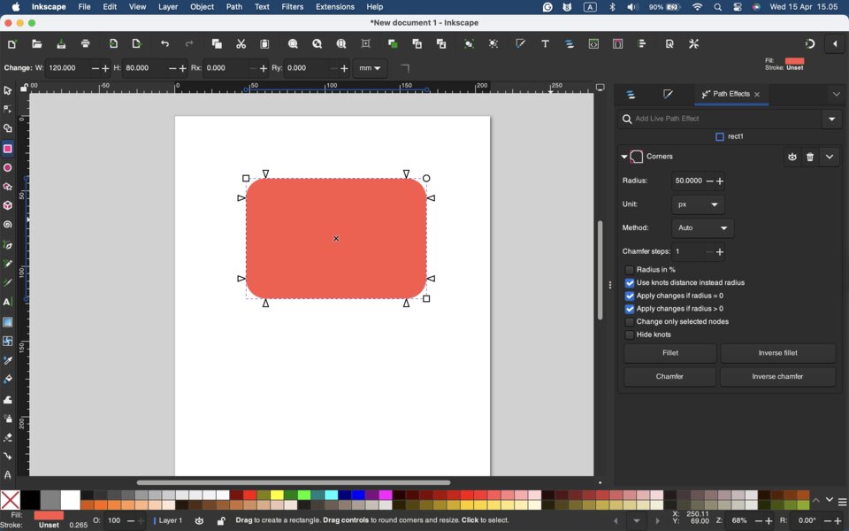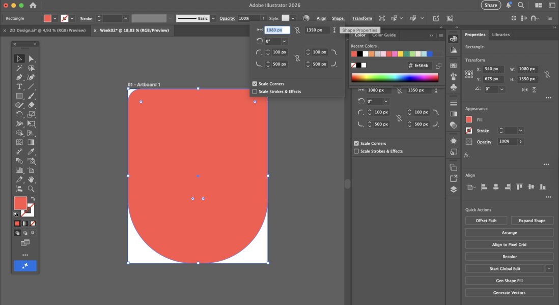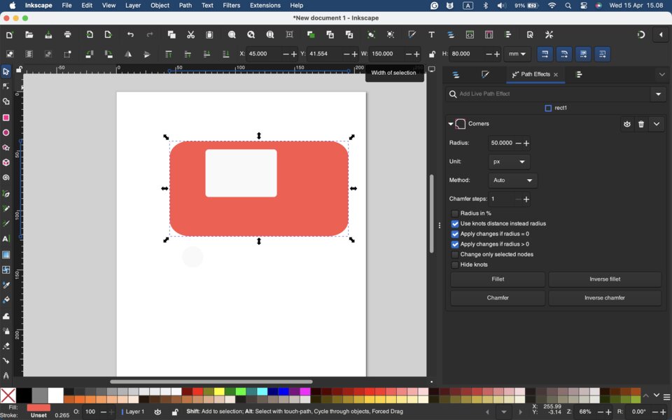 - created a rectangle using the Rectangle Tool (shortcut: R). I adjusted its size and added rounded corners (fillet).