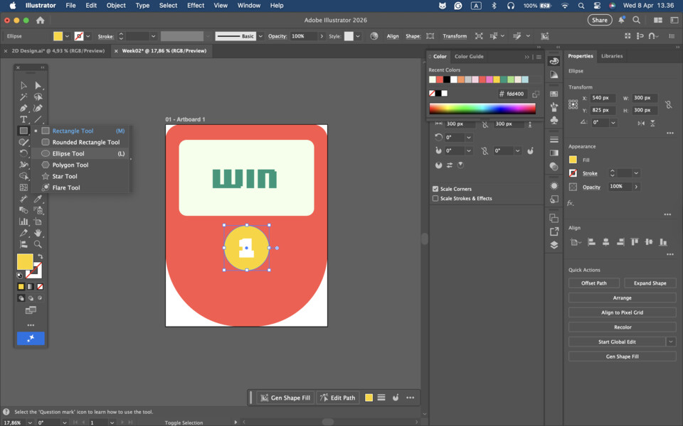 I created the first button using the ‘Ellipse Tool’ and changed its color to #fdd400. Then, I added the text “1” inside the circle.