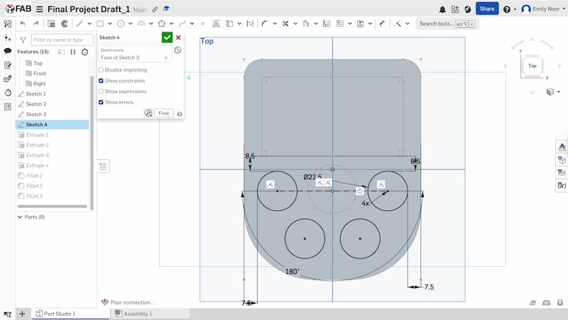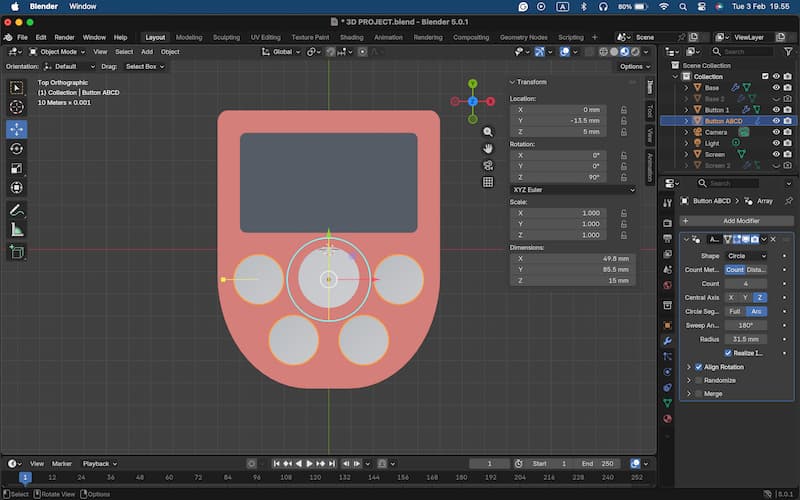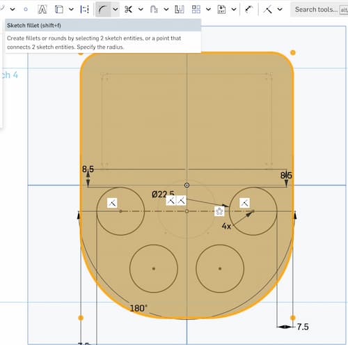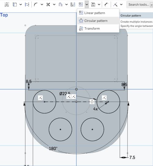 - I applied Sketch Fillet to round the corners and Circular Pattern to evenly arrange the “ABCD” buttons: