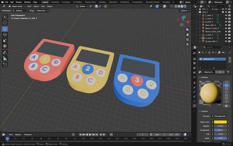 Next, I duplicated the first game console to create the other two (However, when duplicating objects in Blender, the colors remain linked to the original, so it’s important to delete or change the color afterward):