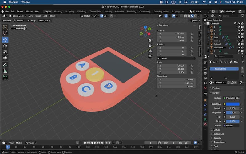 I added some colors to the onjects and used add modifiers -> Generate -> Array (Shape: Circle) to evenly arrange the “ABCD” buttons: