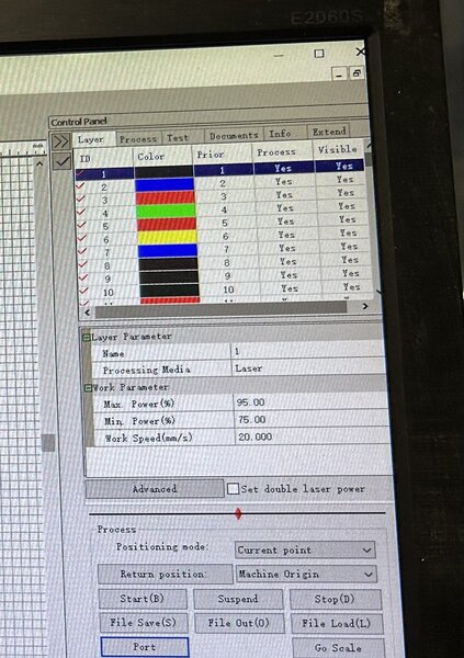 (On the computer) Adjust the settings: layer parameters, work parameters, the number of cutting passes, and etc. (different layer colors correspond to different work parameters, allowing you to adjust each shape with different settings):