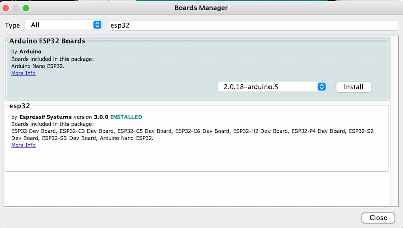 Tools -> Board -> Boards Manager, type the keyword “esp32” in the search box, select the latest version of esp32, and install it: