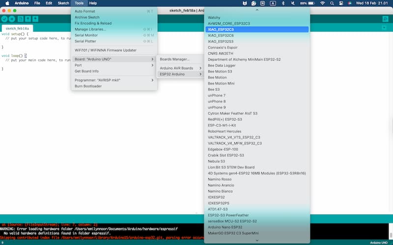 Navigate to: Tools -> Board -> ESP32 Arduino -> select “XIAO_ESP32C3”.