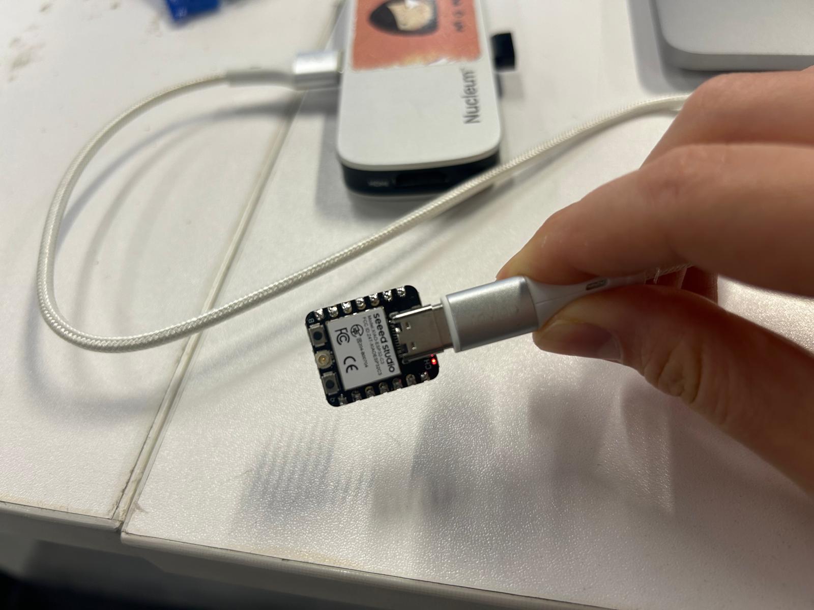 Connect the XIAO ESP32C3 on Mac: Hold down the BOOT button on XIAO ESP32-C3 to enter into bootloader mode and plug the USB Type-C cable into PC.